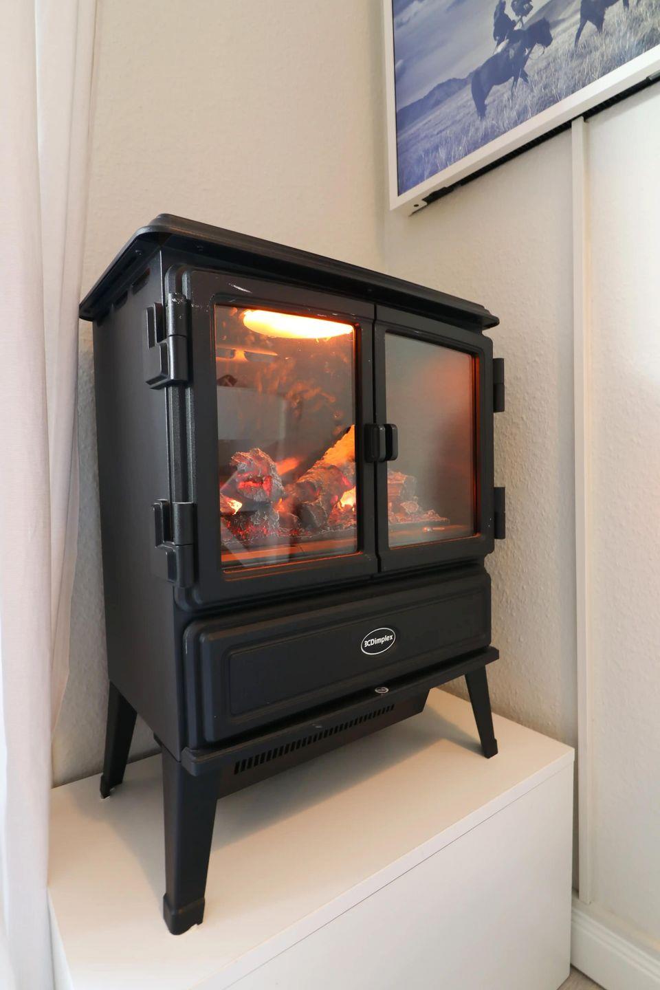 Das gemütliche Wohnzimmer ist ausgestattet mit einer modernen Schlafcouch (140 x 190 cm), einem Esstisch, dem Samsung Multimedia TV „The Frame“ (43 Zoll), einem Sonos Wifi Lautsprecher und einem Elektrokamin mit Fernbedienung.