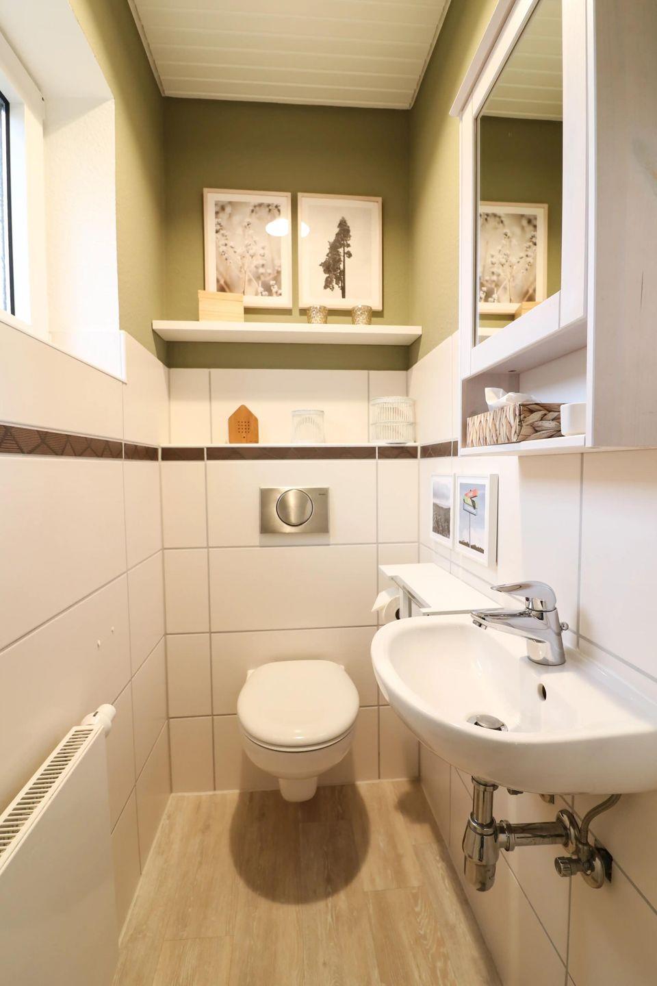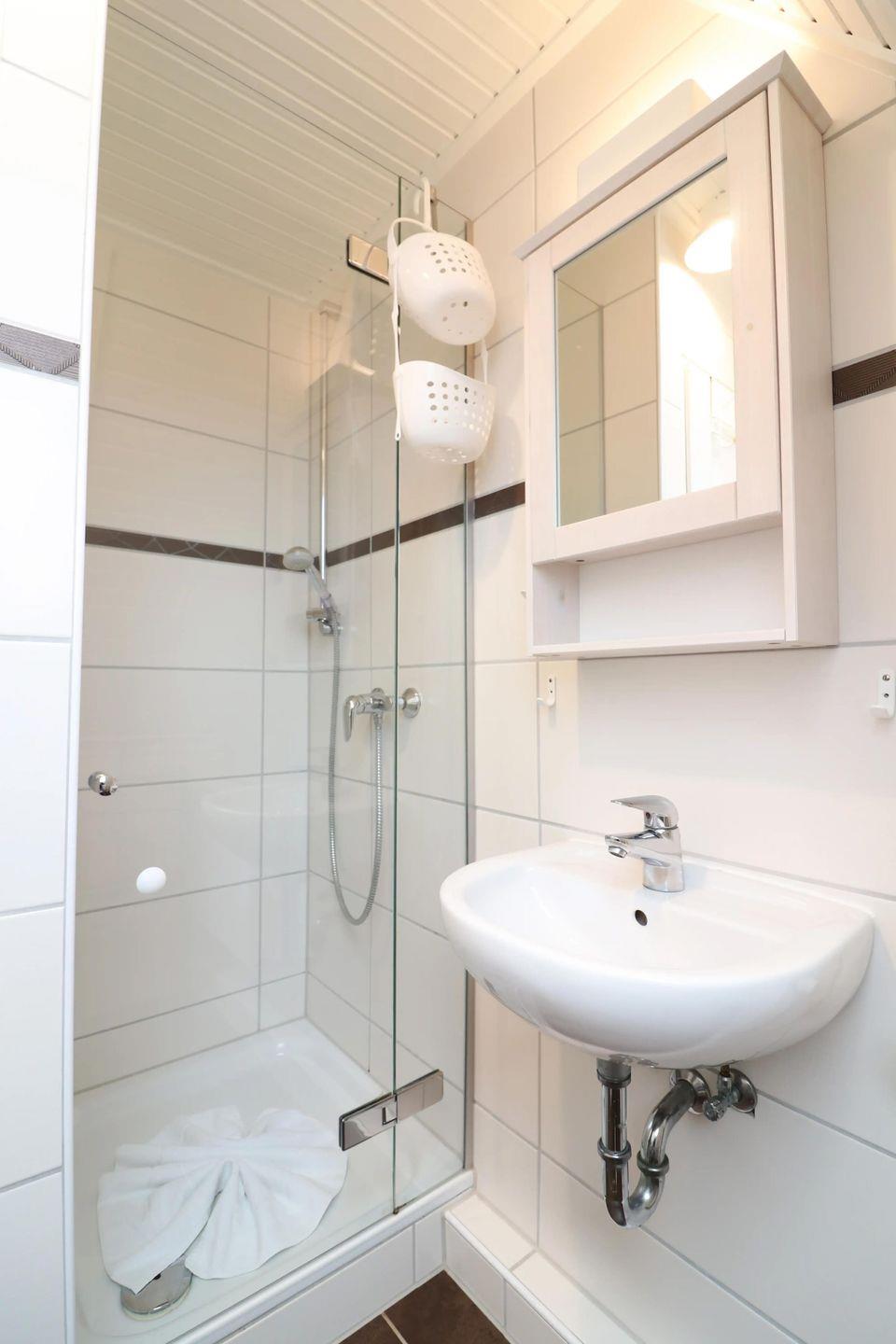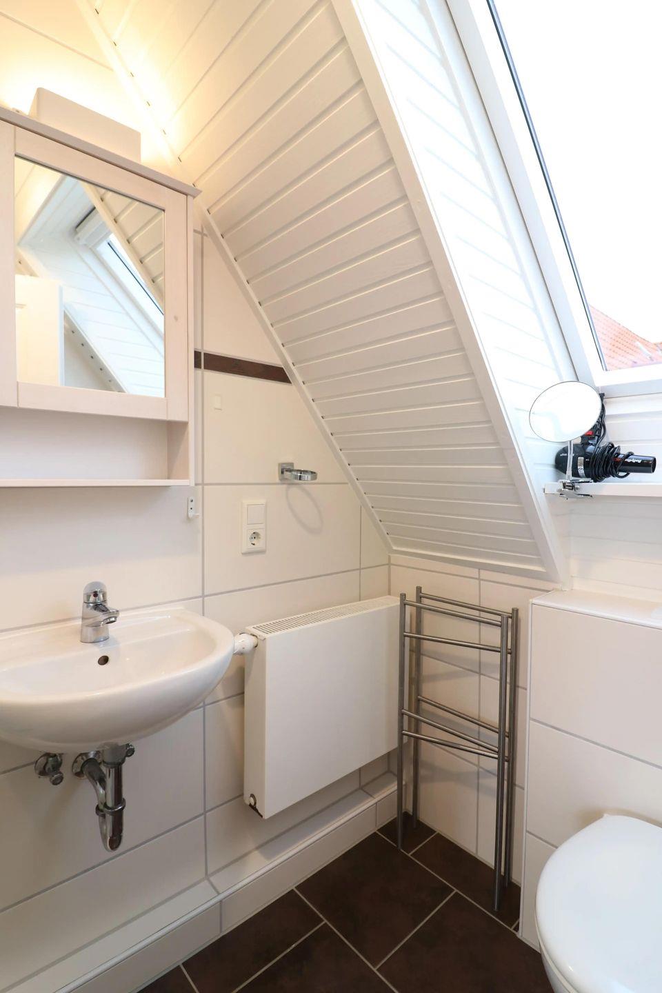 Das Badezimmer ist mit einer Dusche, einem Waschbecken, einem WC und einem Haartrockner ausgestattet. Ein separates WC befindet sich im Erdgeschoss.