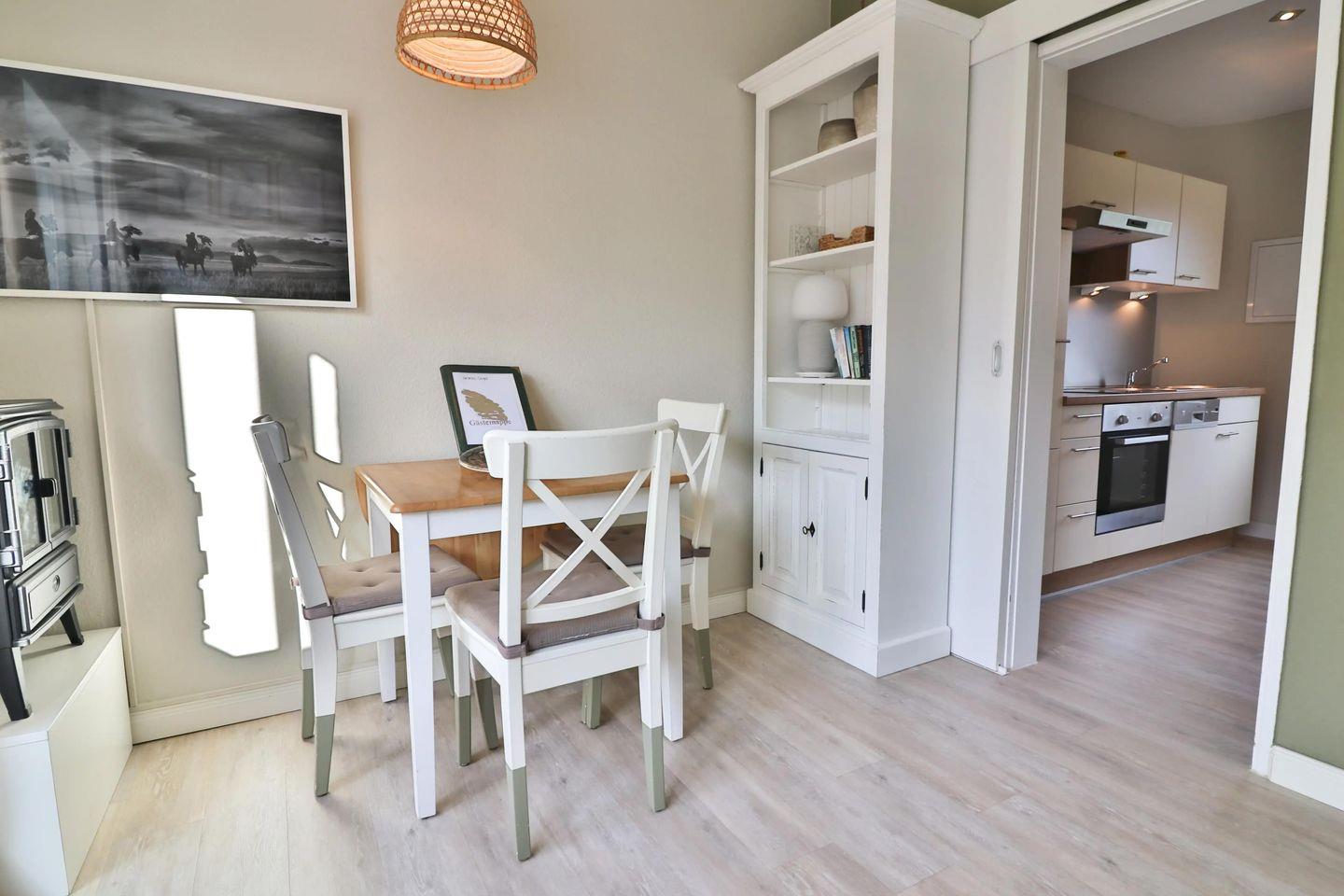 Die Wohnung ist aufgeteilt in ein Schlafzimmer, ein Wohnzimmer mit Essbereich, eine Küchenzeile, ein Badezimmer, ein separates WC und eine Terrasse mit einem Strandkorb.