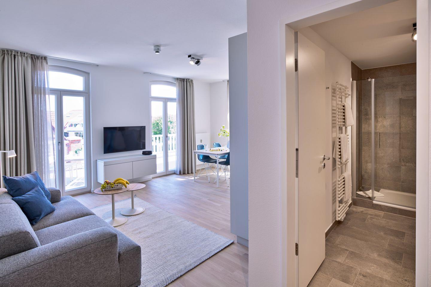 Das geschmackvoll eingerichtete Nichtraucher-Apartment verfügt über kostenfreies WLAN, bodentiefe Fenster und eine voll ausgestattete offene Küche mit Geschirrspüler, Kühlschrank mit Gefrierfach, Filterkaffeemaschine, Toaster, Wasserkocher, Backofen und 4-Felder Induktionsherd sowie über einen behaglichen Wohn-Essbereich. Im Wohnbereich befinden sich ein SMART-TV (43 Zoll) und ein Bluetooth-Lautsprecher.