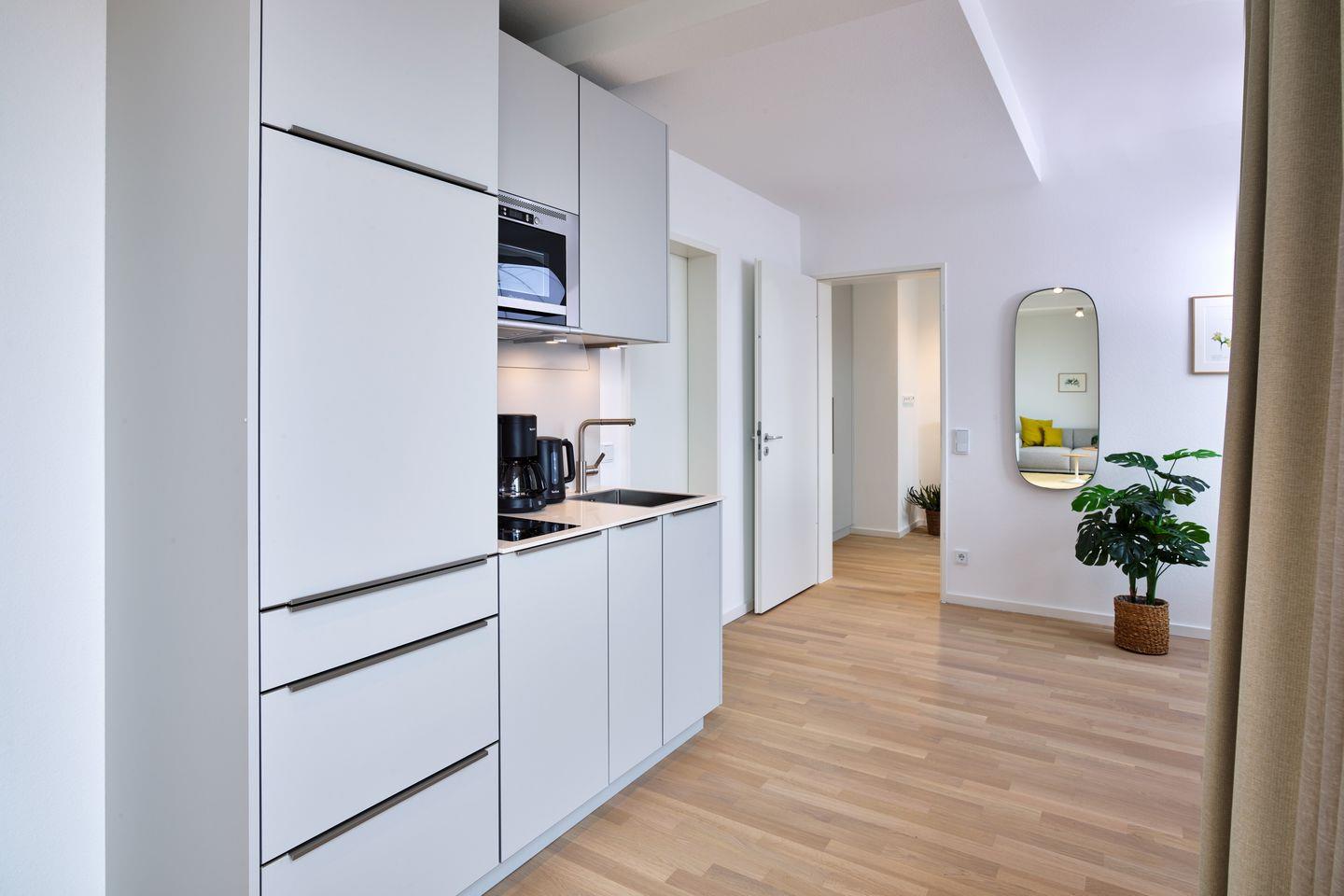 Das geschmackvoll eingerichtete Nichtraucher-Apartment verfügt über kostenfreies WLAN, bodentiefe Fenster und eine voll ausgestattete offene Küche mit Geschirrspüler, Mikrowelle mit Backofenfunktion, Kühlschrank mit Gefrierfach, Filterkaffeemaschine, Toaster, Wasserkocher und 2-Felder Induktionsherd sowie über einen behaglichen Wohn-Essbereich. Im Wohnbereich befinden sich ein SMART-TV (43 Zoll) und ein Bluetooth-Lautsprecher.