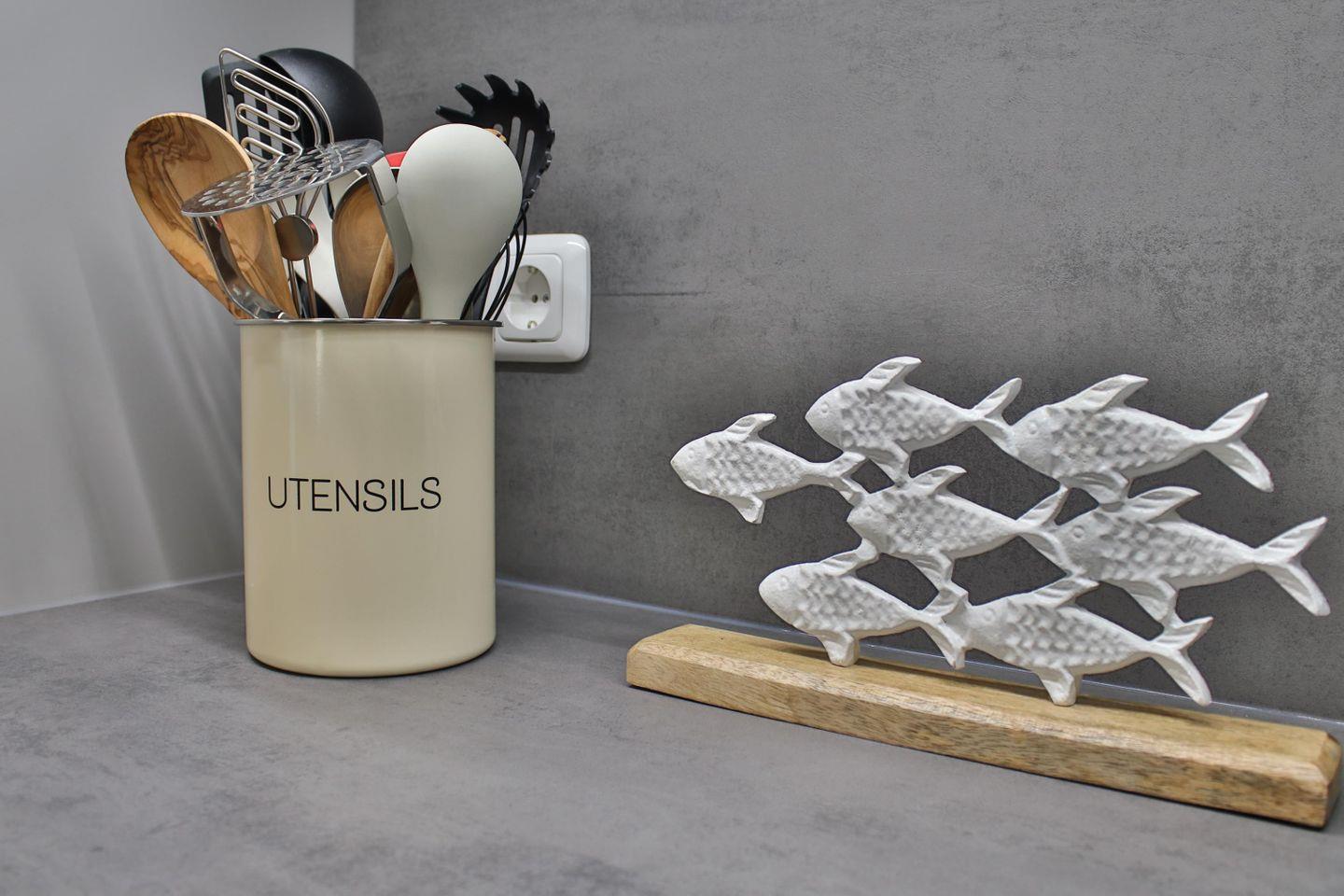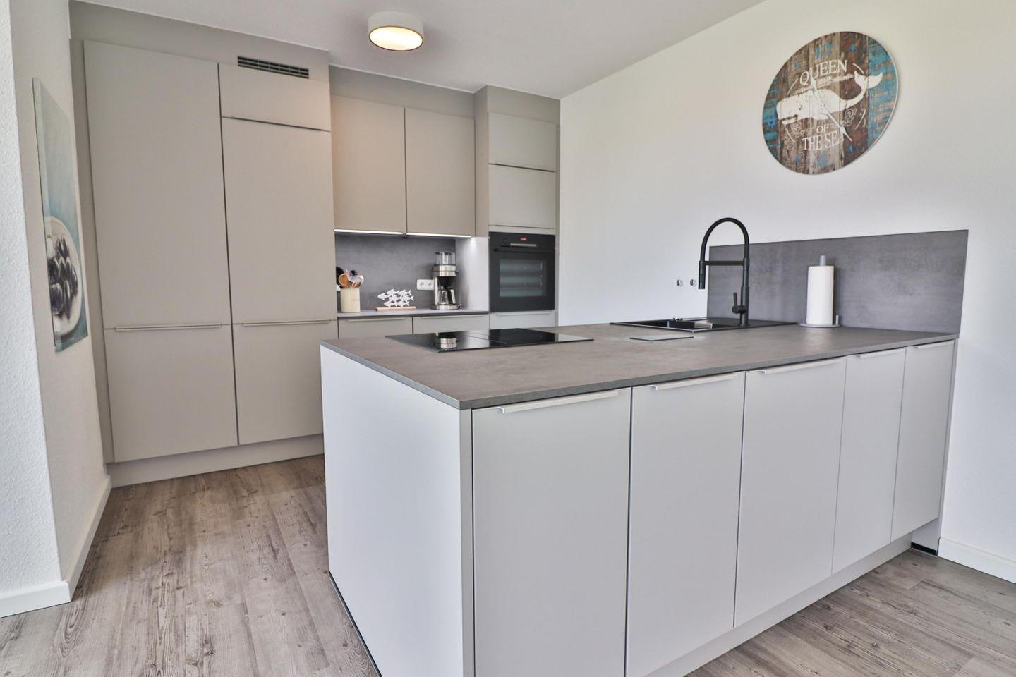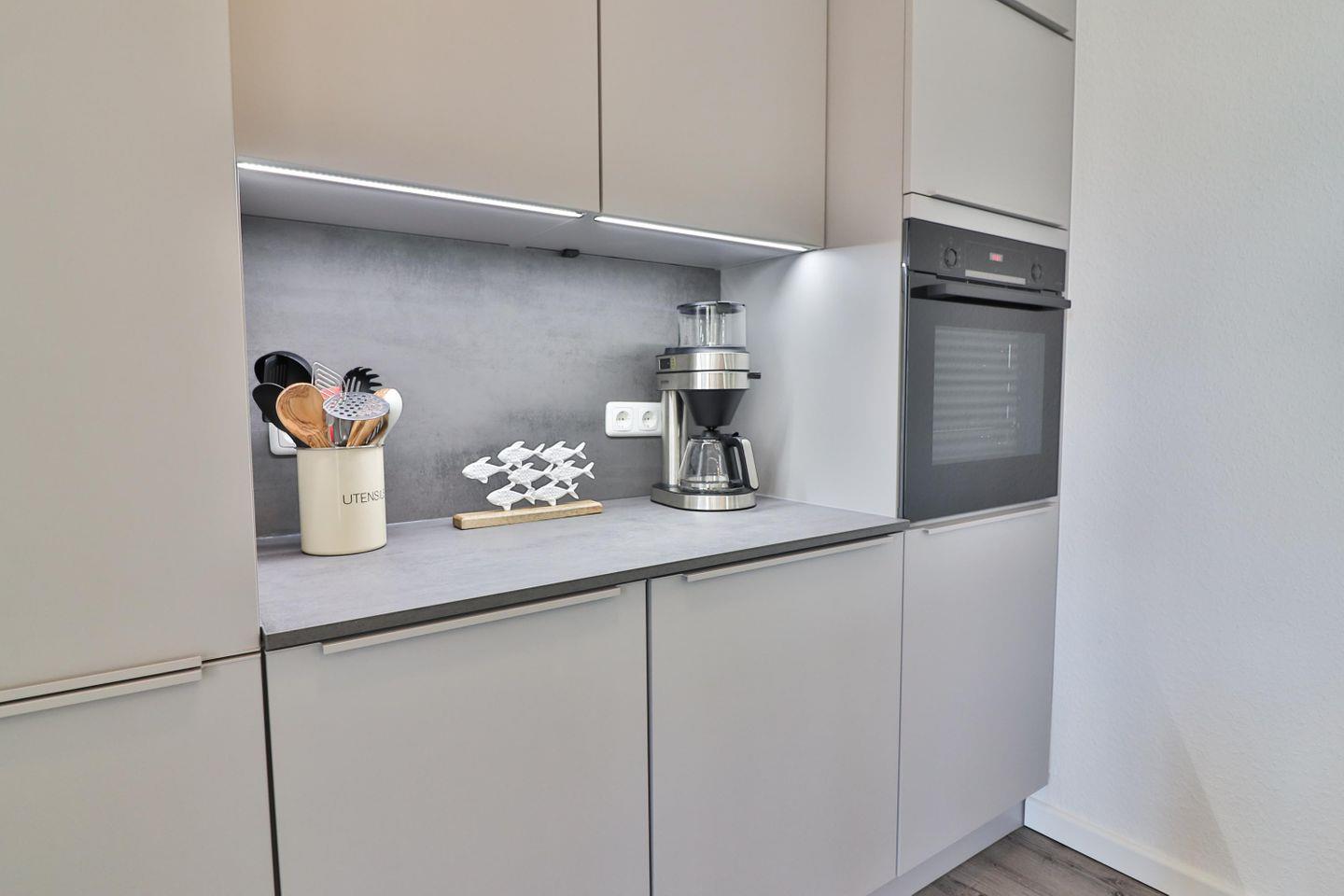 Die Küche ist sehr hochwertig ausgestattet und lässt keine Wünsche offen. Eine große Kochinsel mit einem 4-Platten-Herd und einem Kochfeldabzug ermöglicht Ihnen bequemes Kochen. In der Küche finden Sie außerdem ein großes Spülbecken, einen erhöhten Backofen, eine Spülmaschine, einen Kühlschrank, einen separaten Gefrierschrank, eine Mikrowelle, eine Filterkaffeemaschine, ein Handrührgerät, einen Eierkocher, einen Toaster und einen Wasserkocher. Neben diversen Küchenutensilien und einer großen Auswahl an Geschirr finden Sie darüber hinaus Teegeschirr, um entspannte Urlaubstage bei einer Tasse Ostfriesentee ausklingen zu lassen.