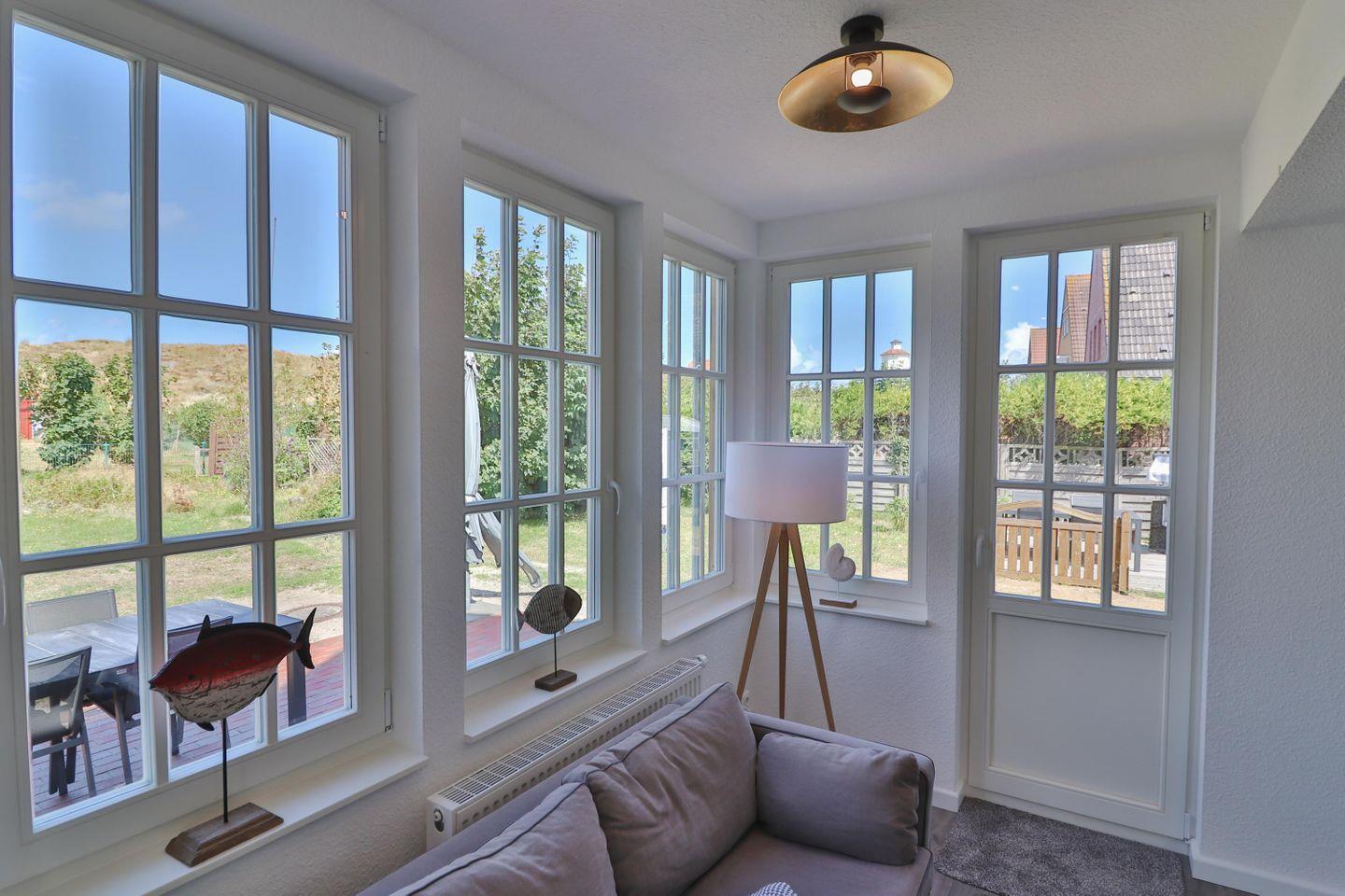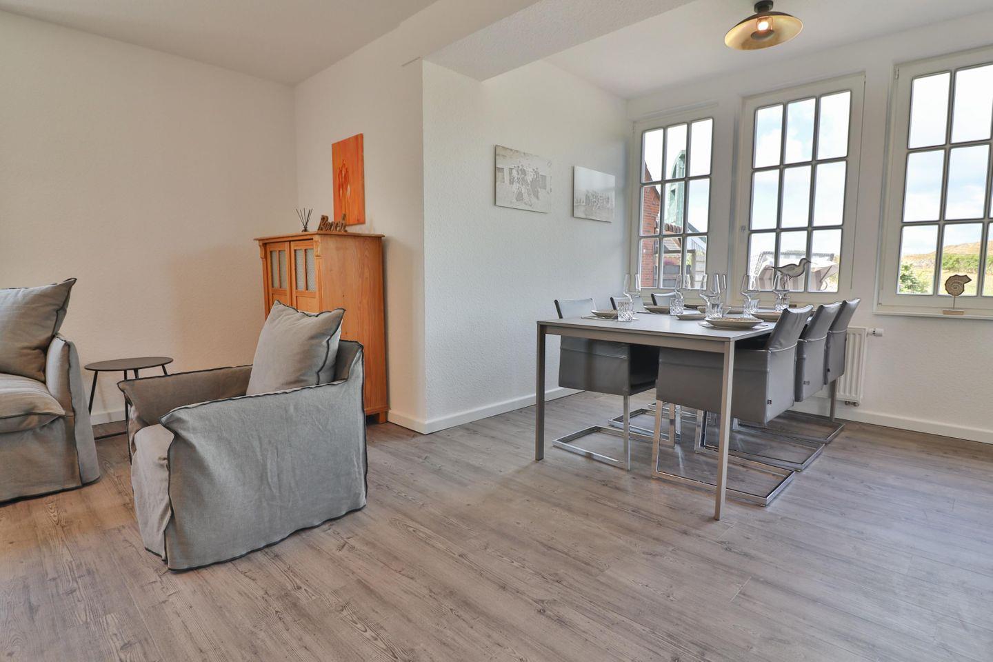 Der Wohn- und Essbereich ist großzügig gestaltet und bietet zwei bequeme Sofas und zwei Sessel, auf denen Sie sich entspannen können. Für Ihre Unterhaltung gibt es einen großen Fernseher. Der Essbereich verfügt über einen Esstisch mit Stühlen und bietet einen wunderschönen Ausblick auf den Wasserturm und die malerischen Dünen.