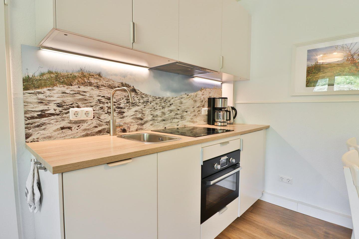 In der gut ausgestatteten Küchenzeile finden Sie alles, was Sie für die Zubereitung Ihrer Lieblingsspeisen benötigen: ein Ceranfeld, Backofen- und Mikrowellenkombigerät, Kühlschrank, Spülmaschine sowie eine Kaffeemaschine, Wasserkocher und ein Toaster stehen Ihnen zur Verfügung.