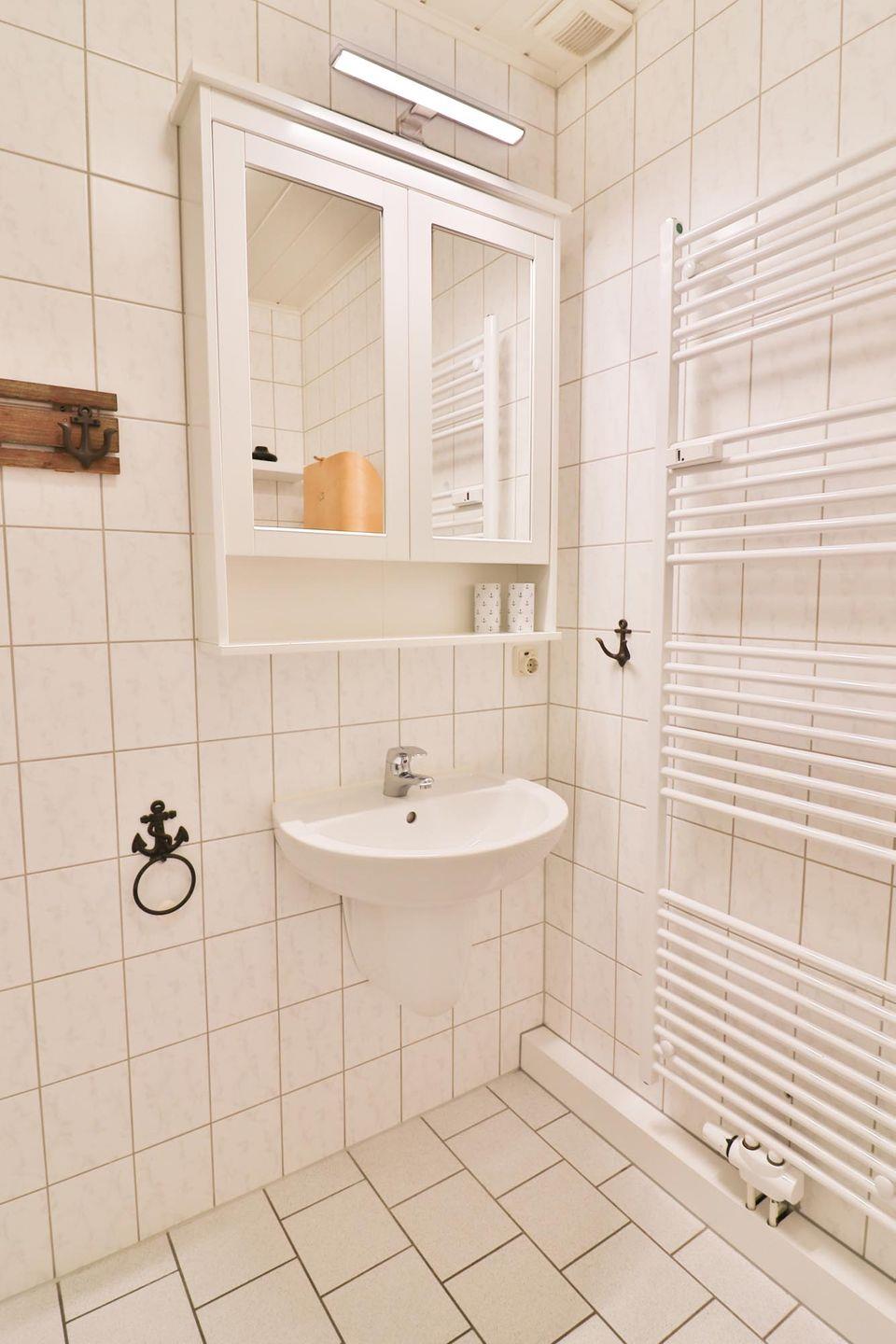 Das Badezimmer ist mit einer Dusche, einem WC und einem Waschbecken ausgestattet. Besonders praktisch ist der Wickeltisch zum Ausklappen, der speziell für Familien mit Kleinkindern gedacht ist.