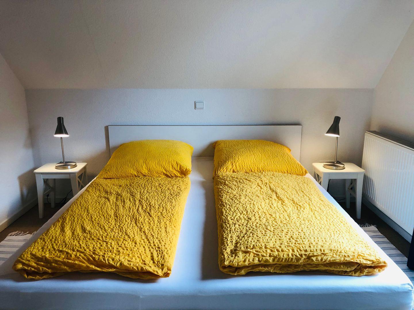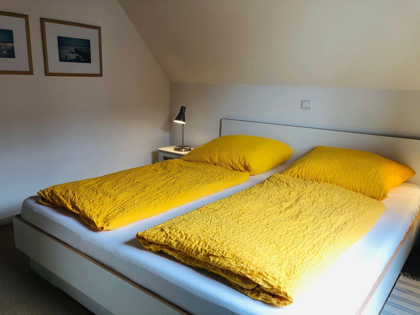 1 Schlafzimmer mit Doppelbett, 1 Schlafzimmer mit zwei Einzelbetten und eigenem Balkon