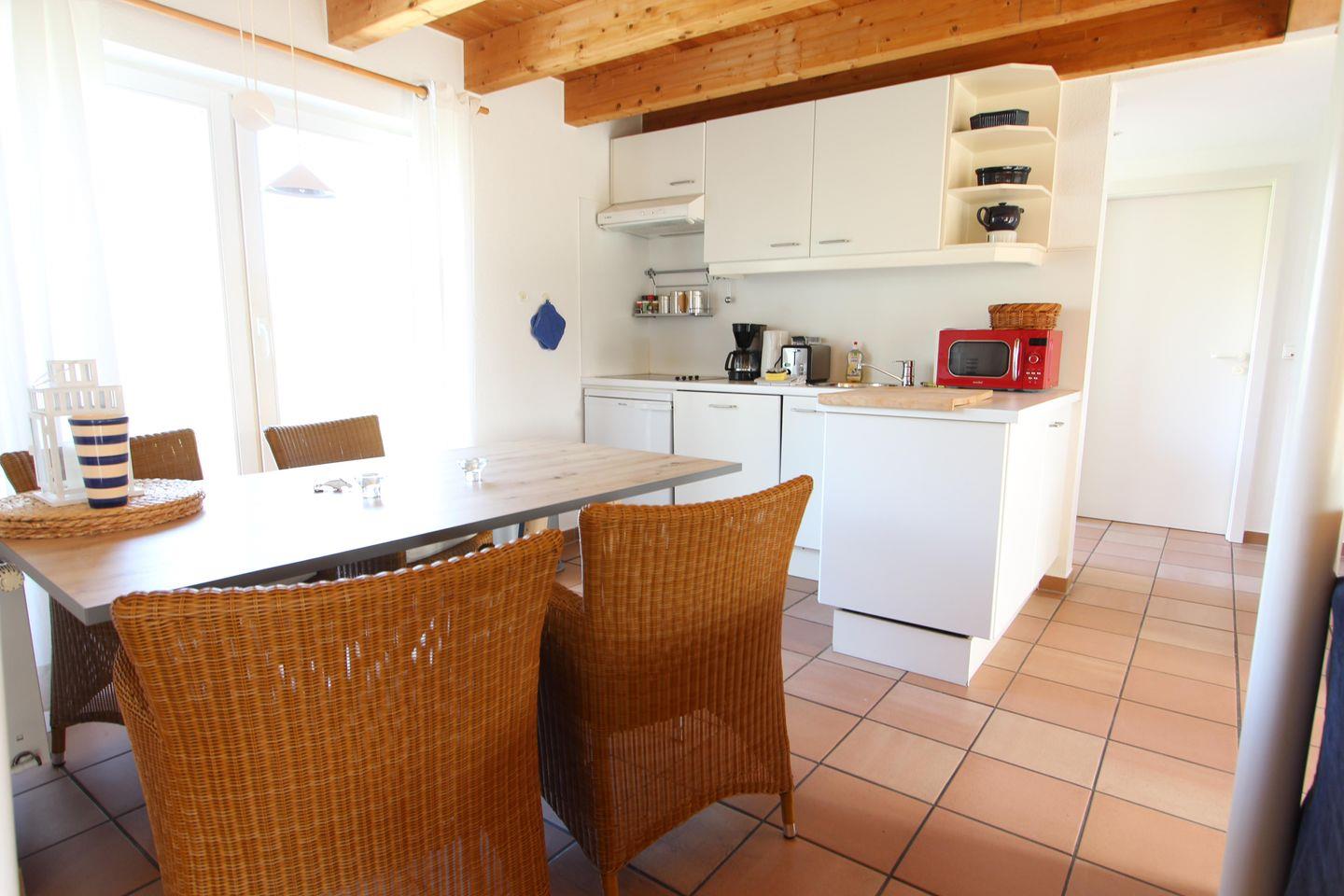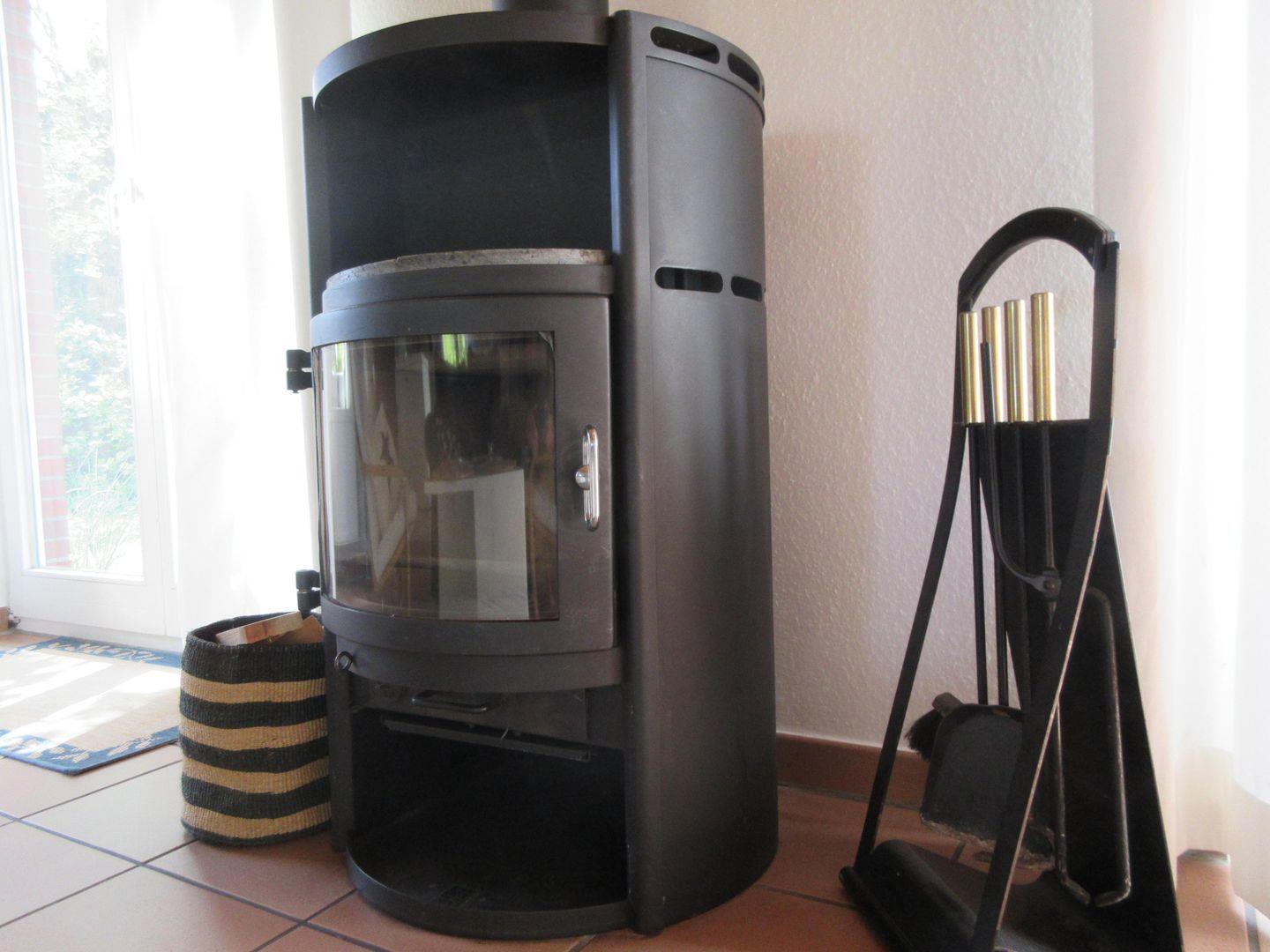 FERIENHAUS RENNER, Am Wall 16 (ca. 70 m²): Wohn-/Esszimmer mit dänischem Kaminofen, eigener Garten und große Terrasse mit Strandkorb, Liegen und Gartenmöbeln, Einbauküche mit Mikrowelle, Koch-Ceranfeld, Geschirrspüler und Waschmaschine