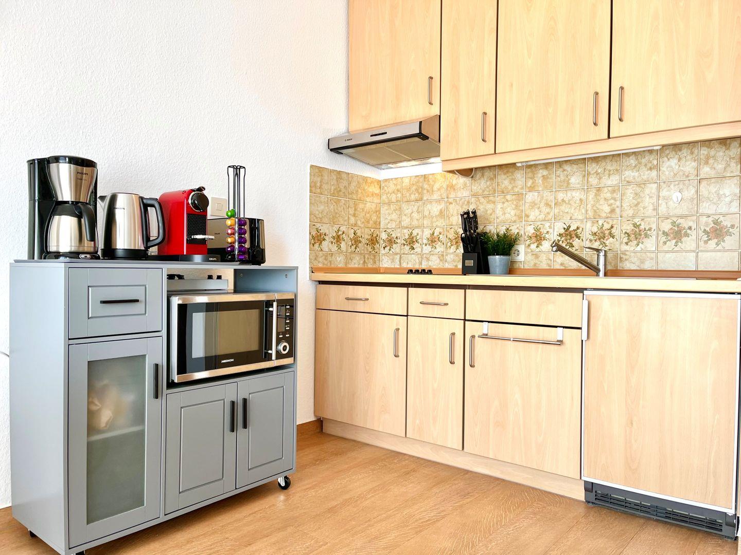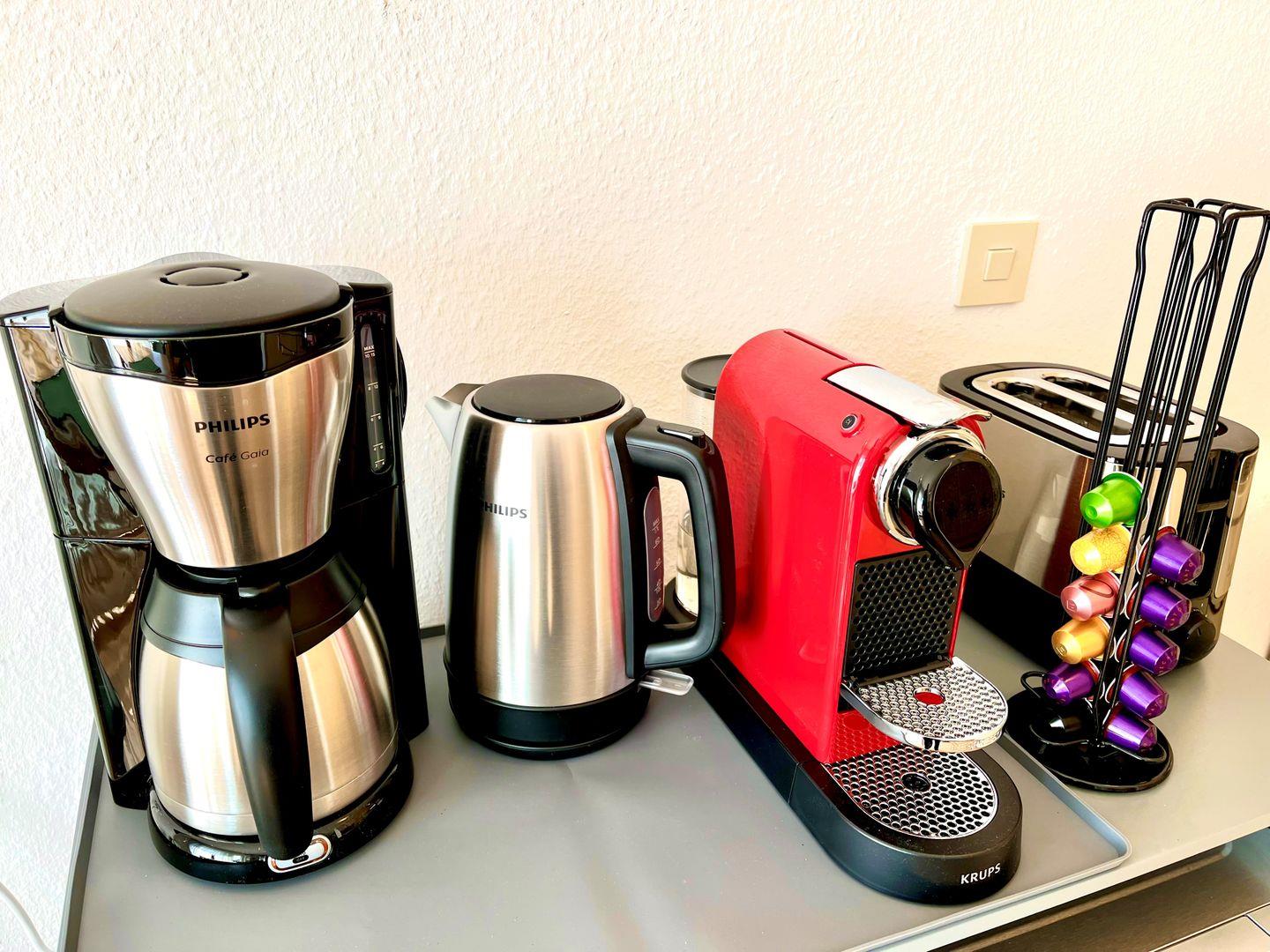 • Eine Essecke sowie eine umfangreich ausgestattete Küchenzeile mit Kühl-Gefrier-Kombination, Herd, Mikrowelle mit Grill- und Backfunktion, Toaster sowie eine Heißgetränkestation mit Filterkaffeemaschine, Nespresso-Kapselmaschine und Wasserkocher