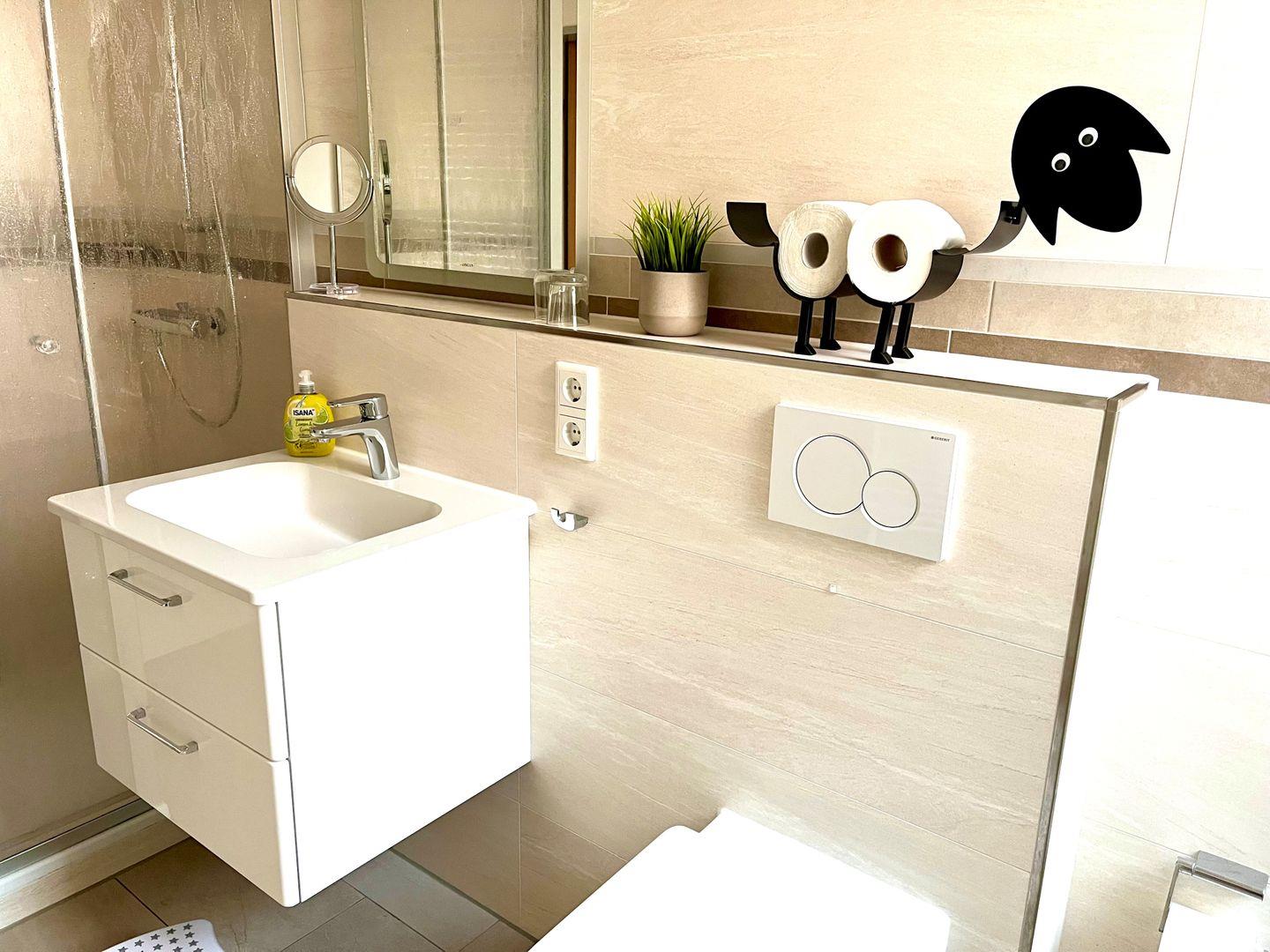 • Ein vor Kurzem vollständig modernisiertes Badezimmer mit Dusche, WC, Föhn, Kosmetikspiegel, Tageslichtfenster, Handtuchheizkörper, Wäscheständer sowie Waschmaschine und Trockner zur kostenlosen Nutzung