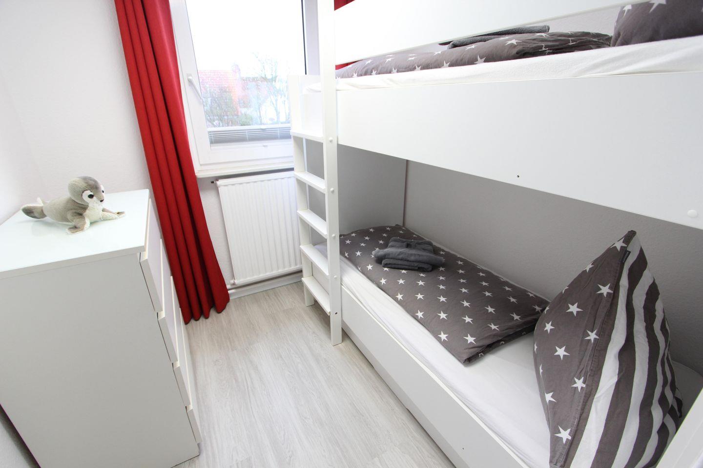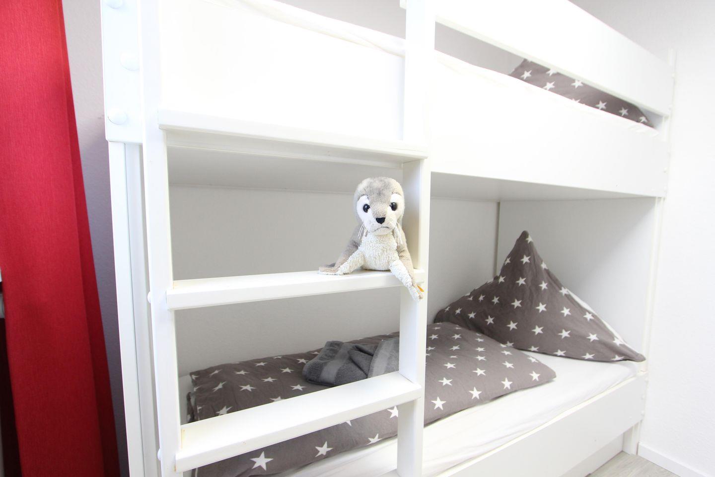 Obergeschosswohnung mit Schlafzimmer mit Doppelbett und Schlafzimmer mit Etagenbett