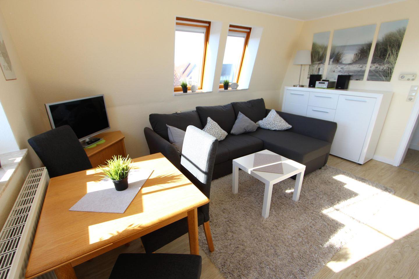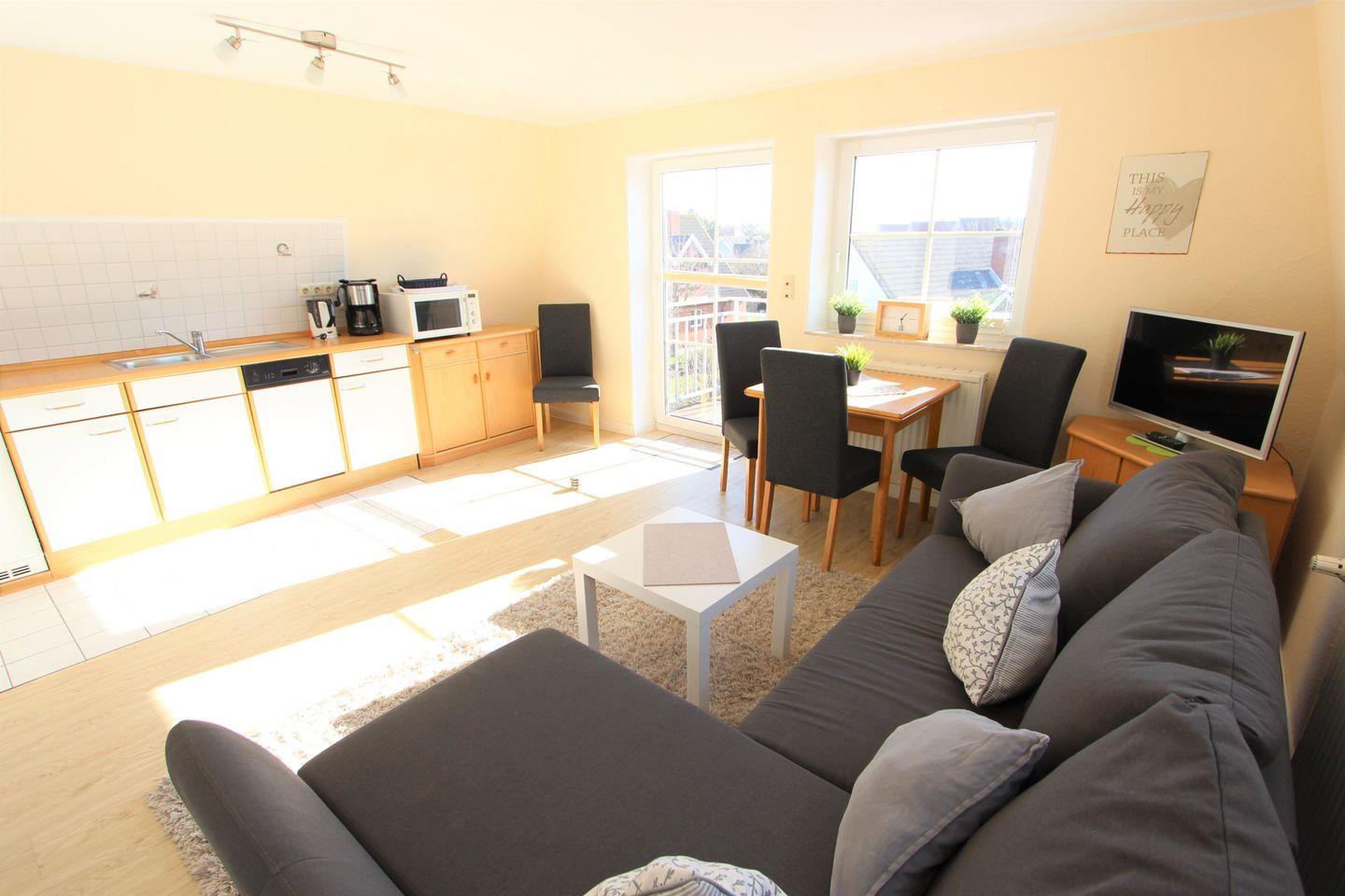 Wohnung, Südbalkon, 1 Schlafzimmer mit einem Doppelbett, Tageslichtbad mit Dusche und WC, Wohn-/Essbereich mit Schlafsofa (1 Person), Einbauküche mit Geschirrspüler, Kühlschrank, Kaffeemaschine, Mikrowelle mit Backfunktion, Toaster, Wasserkocher. Wohnbereich mit Essecke, Kabel-TV, Münzwaschmaschine/Trockner, auf Anfrage Kinderreisebett und Kinderhochstuhl