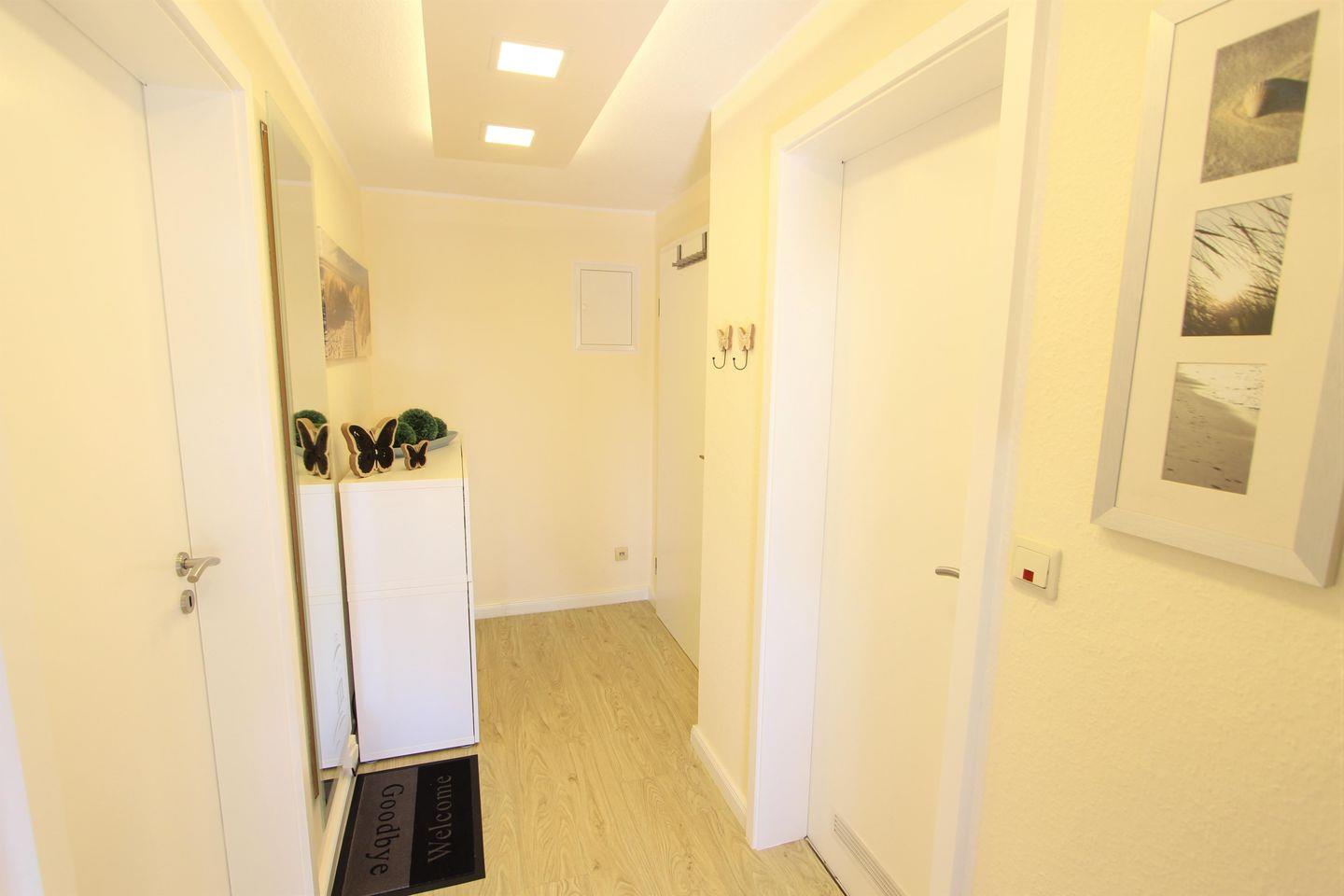 Gemütliche, sonnige und helle Ferienwohnung in 2. Etage für bis zu 3 Personen. Zentrale Lage nahe am Ortskern, dennoch ruhig und mit allen Versorgungsmöglichkeiten. Bäckerei ca. 50 m, Bahnhof ca. 300 m, zum Strand wenige Gehminuten. Die Wohnung verfügt über einen Balkon zur Südseite, mit Blickrichtung Bahnhof. 1 Schlafzimmer mit einem Doppelbett und großem Kleiderschrank, das Bad hat Tageslicht mit weit zu öffnendem Fenster, Dusche/WC. Im Wohn-/Essbereich mit Schlafsofa (1 Person) bietet die vollständig eingerichtet Einbauküche einen Geschirrspüler, Kühlschrank, Kaffeemaschine, Mikrowelle mit Backfunktion, Toaster und Wasserkocher. Im Wohnbereich warten ein bequemes Sofa, ein Couchtisch sowie ein Esstisch mit 3 Stühlen, Kabel-TV und eine HiFi Anlage mit CD Player. Münzwaschmaschine und Trockner befinden sich in einem separaten Hauswirtschaftsraum. Wir stellen Ihnen gerne auf Anfrage ein Kinderreisebett sowie einen Kinderhochstuhl kostenfrei zur Verfügung.