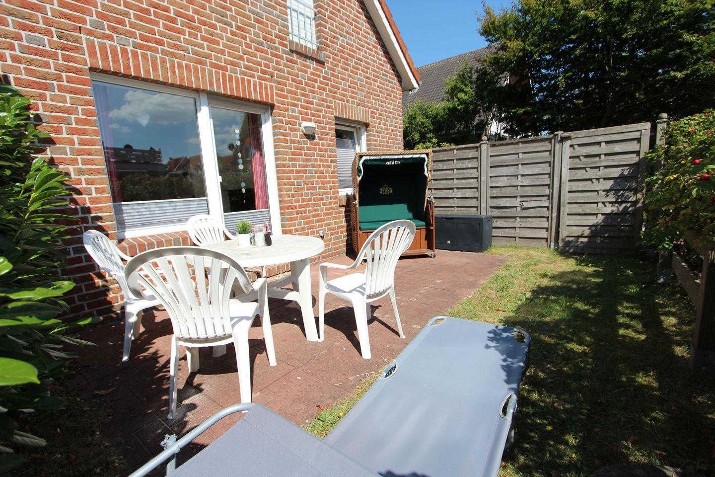 Auf der sonnigen Terrasse stehen für Euch in den warmen Monaten Gartenmöbel bereit.