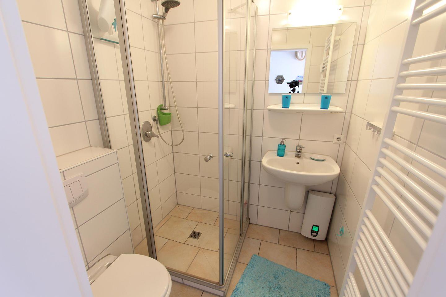 Das moderne Badezimmer ist ausgestattet mit einer Dusche und WC.