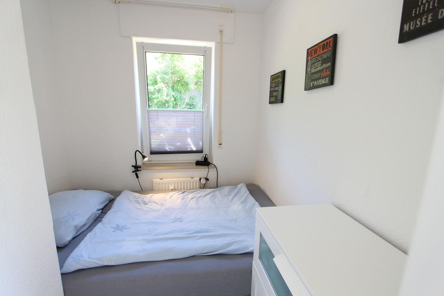 Es gibt zwei getrennte Schlafzimmer mit den Bettmaßen 160 cm x 200 cm und 120 x 200 cm.