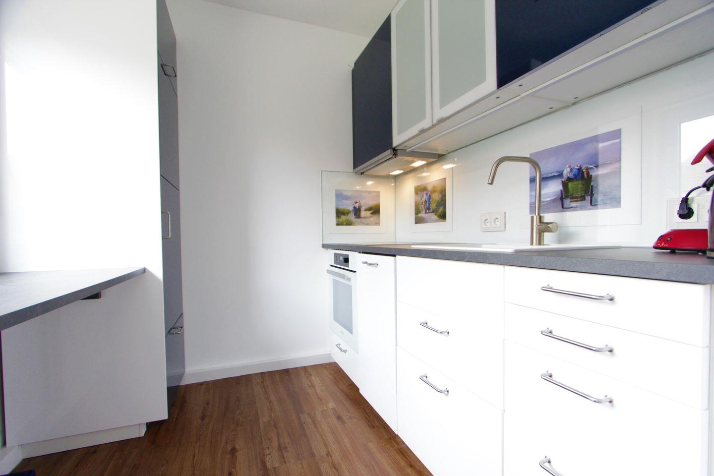 Die hochmoderne Küche ist komplett ausgestattet mit allem was das „Kochherz“ begehrt, Geschirrspüler, 4er Cerankochfeld mit Backofen, Kühlschrank und vielen weiteren Küchenhelfern.