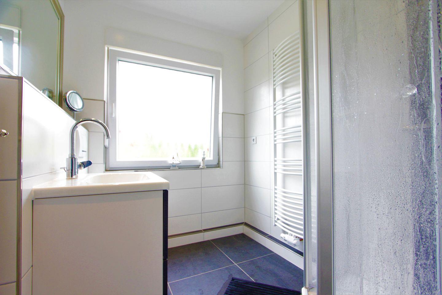 Das neu renovierte Badezimmer verfügt über Dusche und WC.