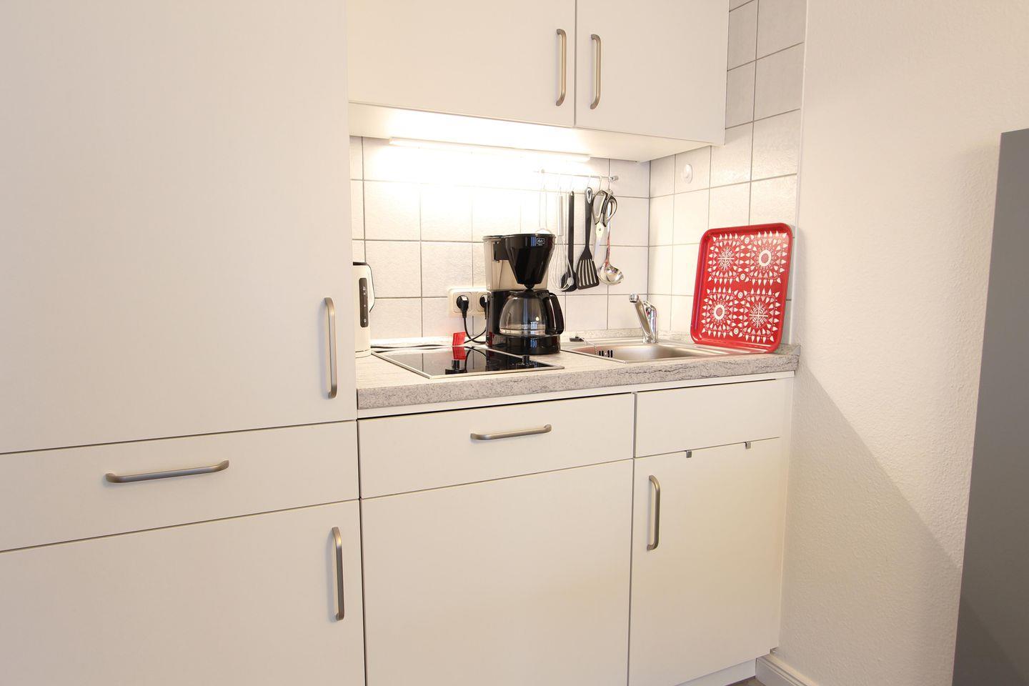 Die Küchenzeile bietet unter anderem ein Cerankochfeld, einen Kühlschrank mit Gefrierfach und einen Geschirrspüler.