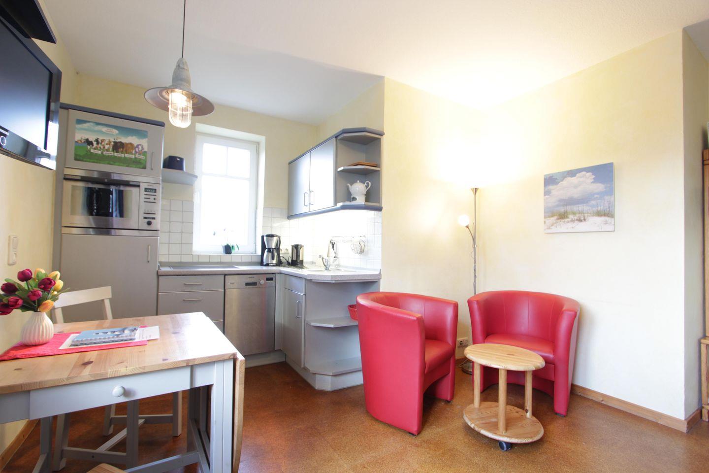 Die Küchenzeile ist voll ausgestattet ; 4 fach Ceranfeld; Mikrowelle mit Backfunktion und Geschirrspüler. Das Badezimmer ist von beiden Räumen aus begehbar.