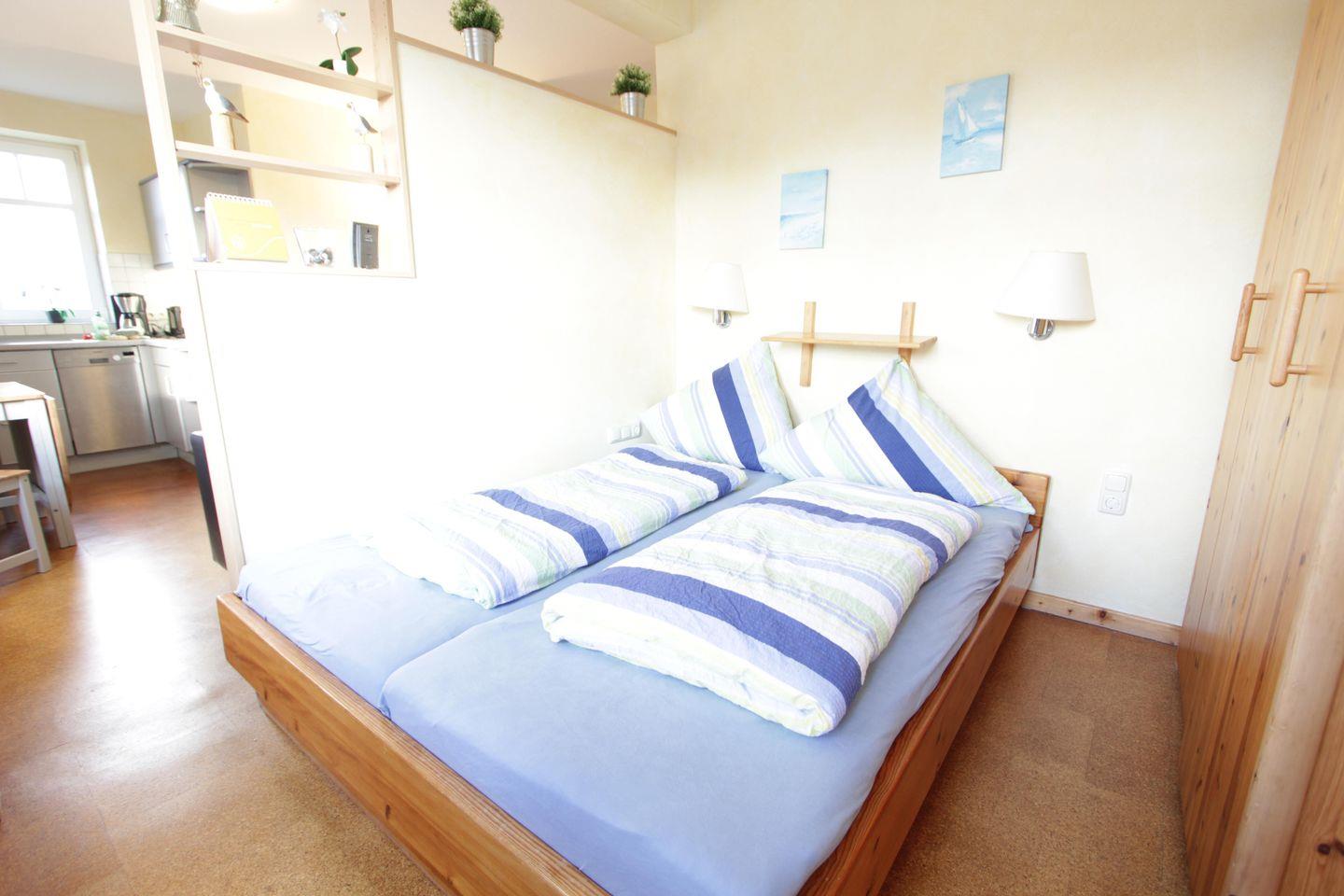 Freundliche, helle Ferienwohnung im 1 Obergeschoss, ca. 37 m², 1 Schlafzimmer mit Etagenbett, 1 Wohn-/Schlafraum mit Doppelbett, welches durch eine Trennmauer vom Wohn-/Essbereich abgetrennt ist.