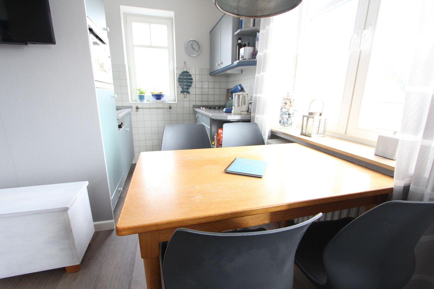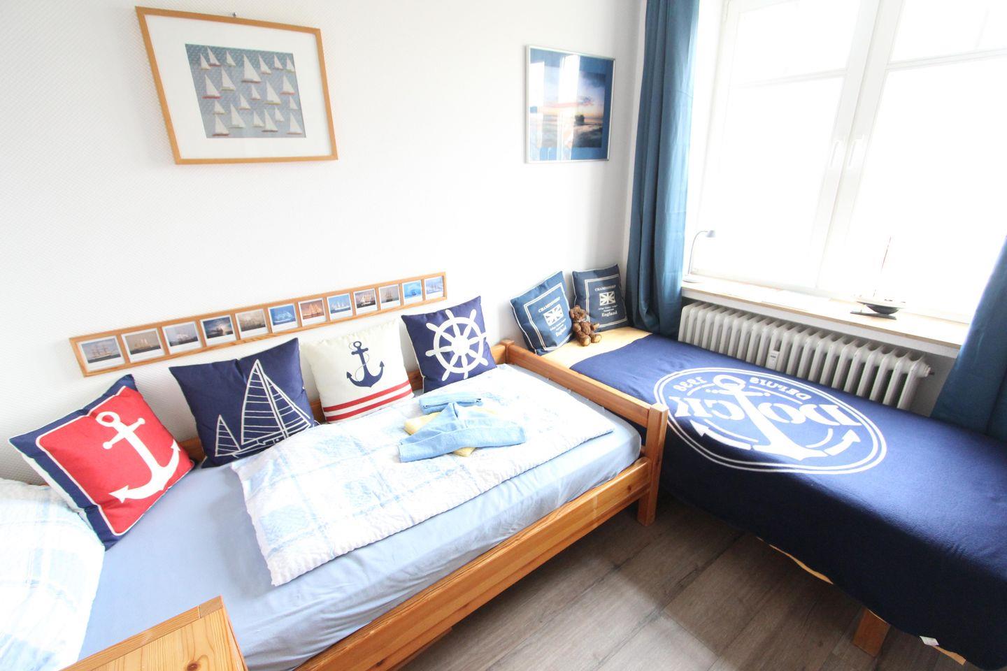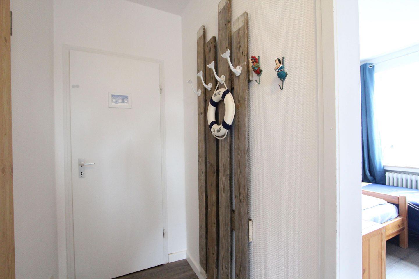 Familienfreundliche, helle und modern maritim eingerichtete Ferienwohnung in einem sehr gepflegten, maritimen Nichtraucherhaus, ca. 50 m², zwei Schlafzimmer mit je einem eigenen Bad mit Dusche & WC, Wohnzimmer, voll ausgestattete Küche. Es gibt eine sonnige Gemeinschaftsterrasse sowie eine kleine Grillecke. Im Haus ist eine Waschküche mit Münzwaschmaschine und Trockner vorhanden.