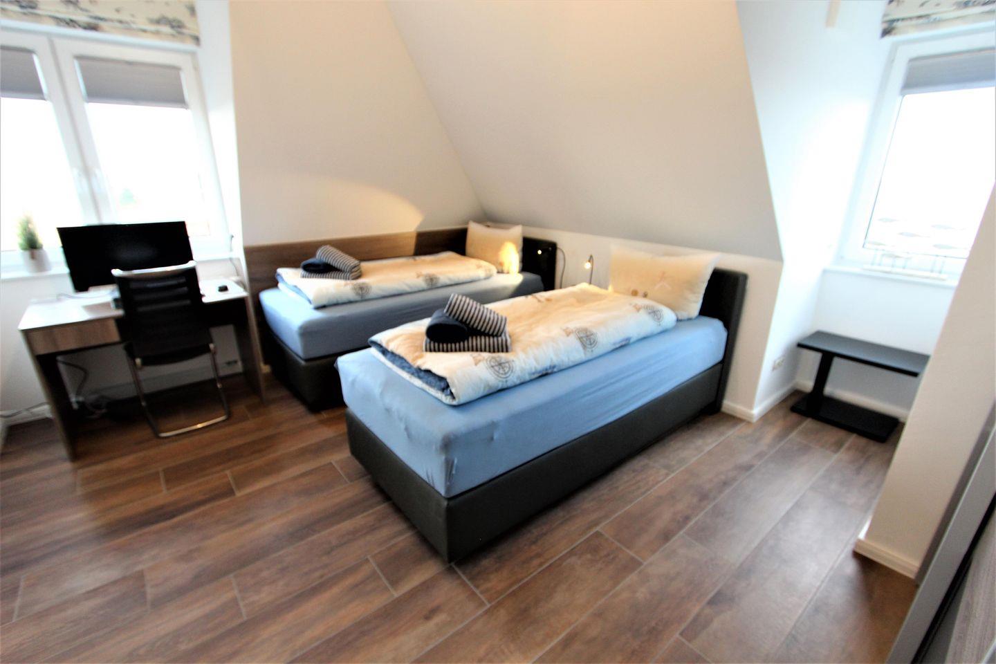 Schlafzimmer mit einem Boxspringbett (180 cm x 200 cm), Schlafzimmer mit 2 Einzelbetten (90 cm x 200 cm, können zusammengeschoben werden)