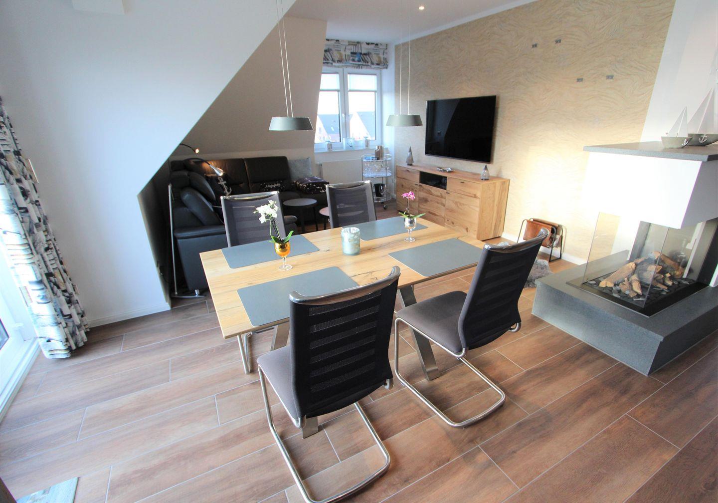 Das helle offene Wohnzimmer ist eingerichtet mit einer gemütlichen Couchecke und einem großen Esstich.