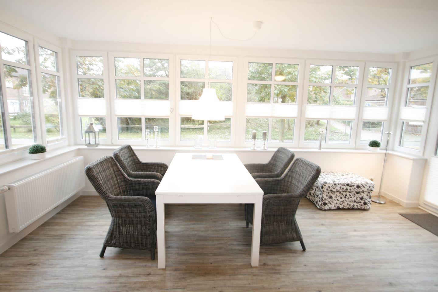 Wunderschöne, hochwertig ausgestattete Ferienwohnung, ca. 80 m², mit Terrasse mit Strandkorb und Terrassenmöbeln, Wohnzimmer und Küche. Wohnzimmer mit Essgelegenheiten, bequemer Couch und TV, komplett ausgestattete Einbauküche mit Cerankochfeld, Geschirrspülmaschine, Toaster, Kaffeemaschine, Wasserkocher. Schlafzimmer (Doppelbett) mit Verdunklungsrollos und TV, modernes Bad ensuite mit Dusche, Gästebad (WC mit Dusche), Waschmaschine im separaten Hauswirtschaftsraum, WLAN vorhanden.