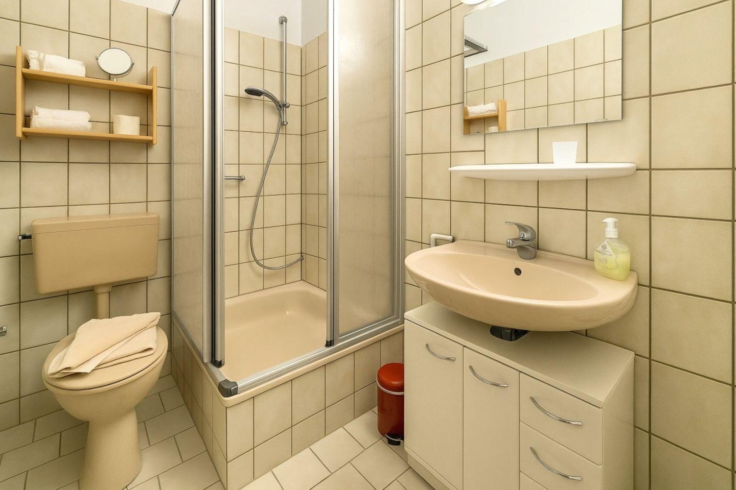 Die Wohnung befindet sich im ersten Obergeschoss und hat einen Balkon; Wohnzimmer mit Sitz- und Essecke, Flat-Screen-TV, DVD-Player, Stereoanlage; Küchenzeile mit Herd und Mini-Backofen; 1 Schlafzimmer mit 2 Einzelbetten; offener Zugang zwischen Wohn- und Schlafraum, Dusche/WC