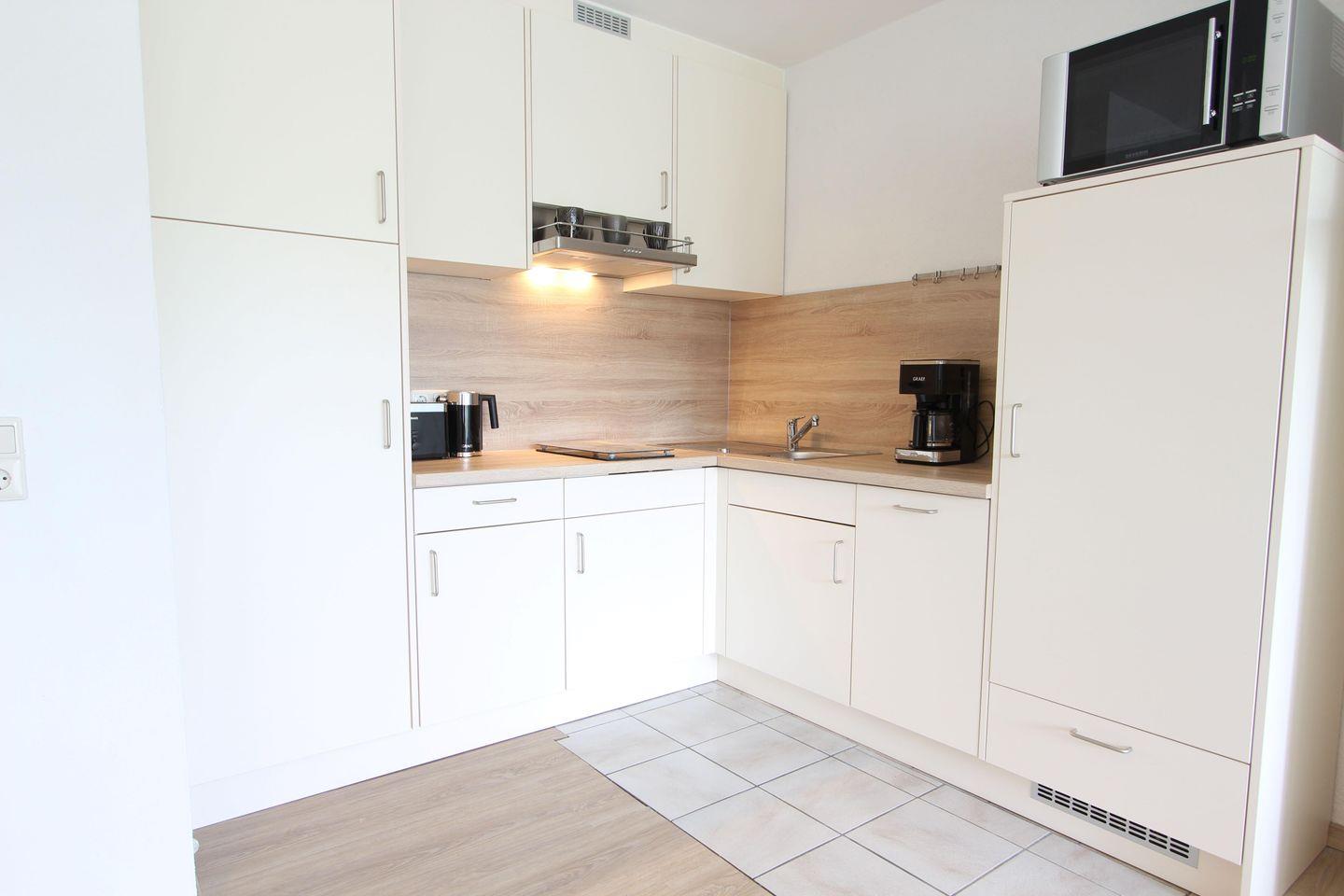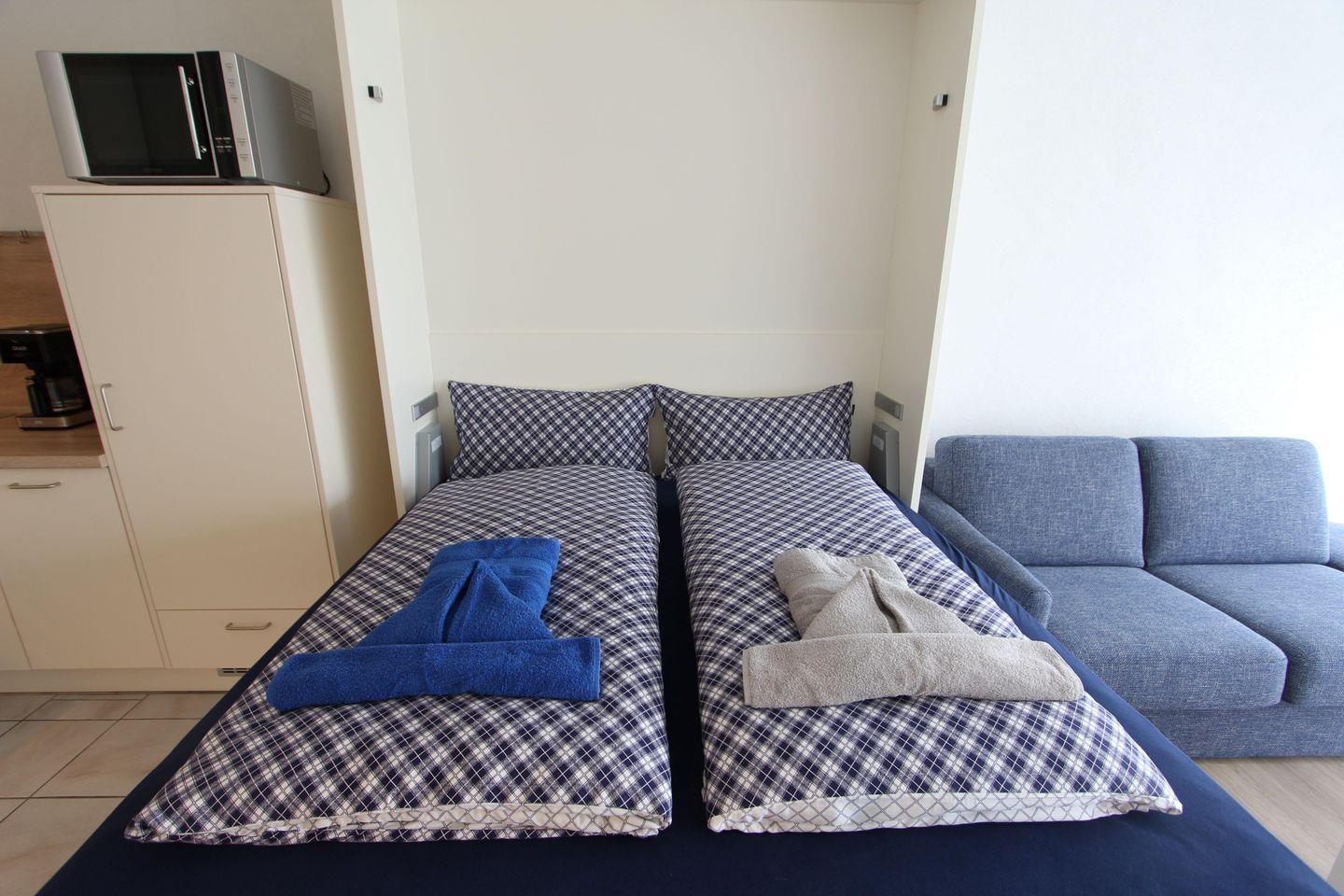 Im Wohnzimmer befindet sich ein neues Schrankbett mit den Maßen 160 cm x 200 cm. Zudem gibt es ein modernes Schlafsofa. Die Küchenzeile ist ausgestattet u.a. mit einem Geschirrspüler, Kühlschrank und einem Kochfeld.