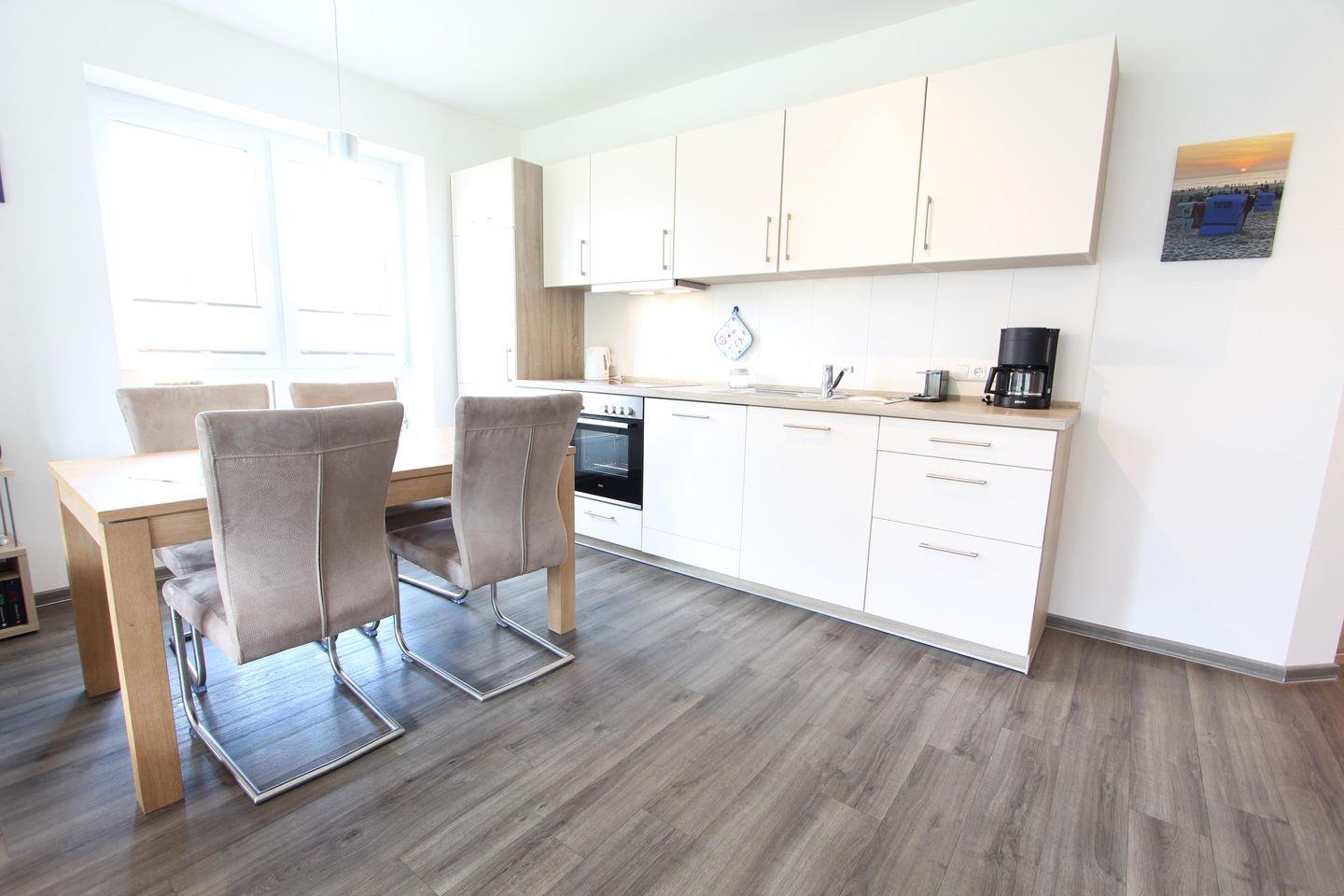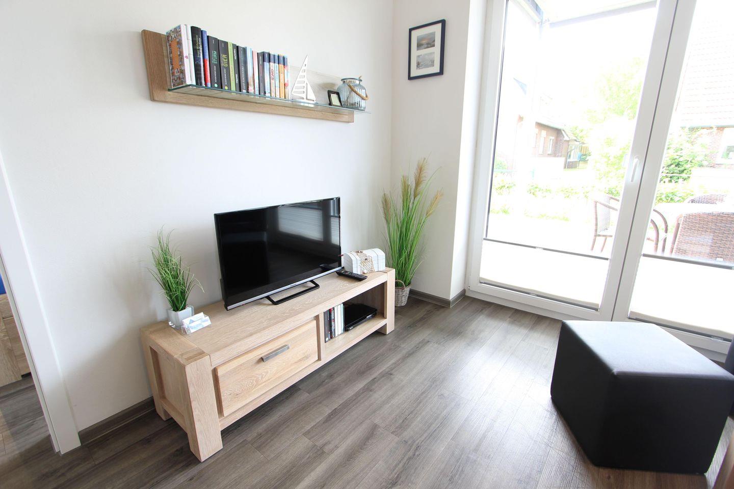 Hochwertig ausgestattete Ferienwohnung, 45 m², mit Gartenanteil und Terrasse, eine Wohnküche mit Essgelegenheit. Wohnküche mit bequemer Couch und Flachbildfernseher, DVD-Player, ausgestattete Einbauküche mit Cerankochfeld, Backofen und Geschirrspülmaschine, Kaffeemaschine und Wasserkocher. Ein Schlafzimmer (Doppelbett mit TV-Flachbildschirm), modernes Bad mit Dusche und WC, Terrassenmöbel mit Auflagen, Waschmaschine und ein Trockner im Keller vorhanden.