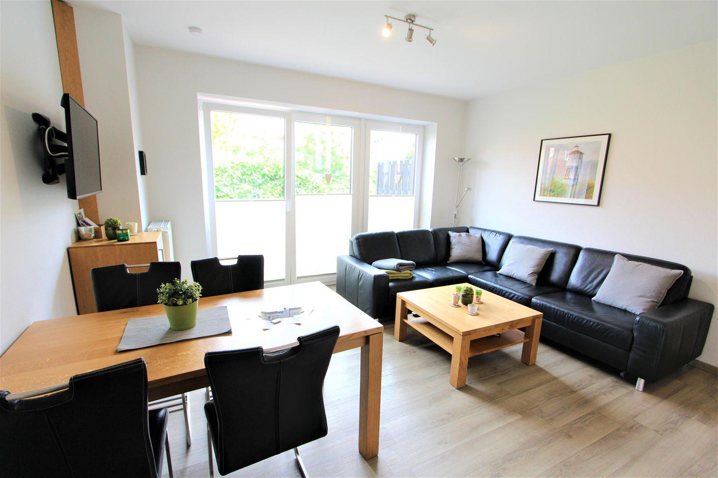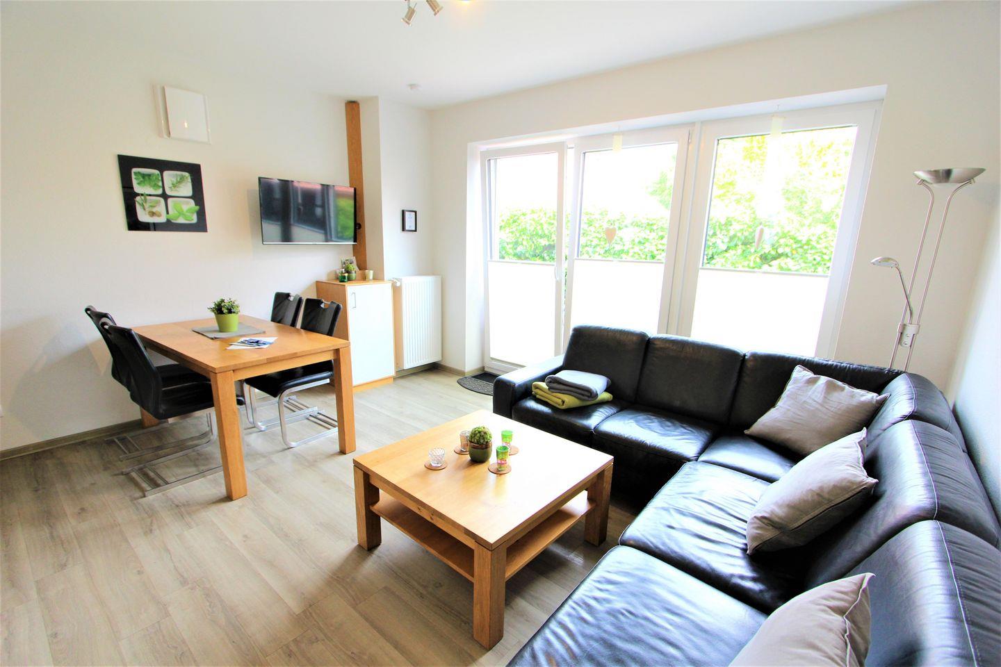 Hochwertig ausgestattete Ferienwohnung, 55 m², mit Gartenanteil und Terrasse, eine Wohnküche mit Essgelegenheiten. Wohnküche mit bequemer Couch und Flachbildfernseher, ausgestattete Einbauküche mit Cerankochfeld, Backofen und Geschirrspülmaschine, Kaffeemaschine und Wasserkocher. Ein Schlafzimmer (Doppelbett, mit TV-Flachbildschirm), ein Schlafzimmer mit einem weiteren Doppelbett, modernes Bad mit Dusche und WC, Terrassenmöbel mit Auflagen, Waschmaschine und Trockner im Keller vorhanden.