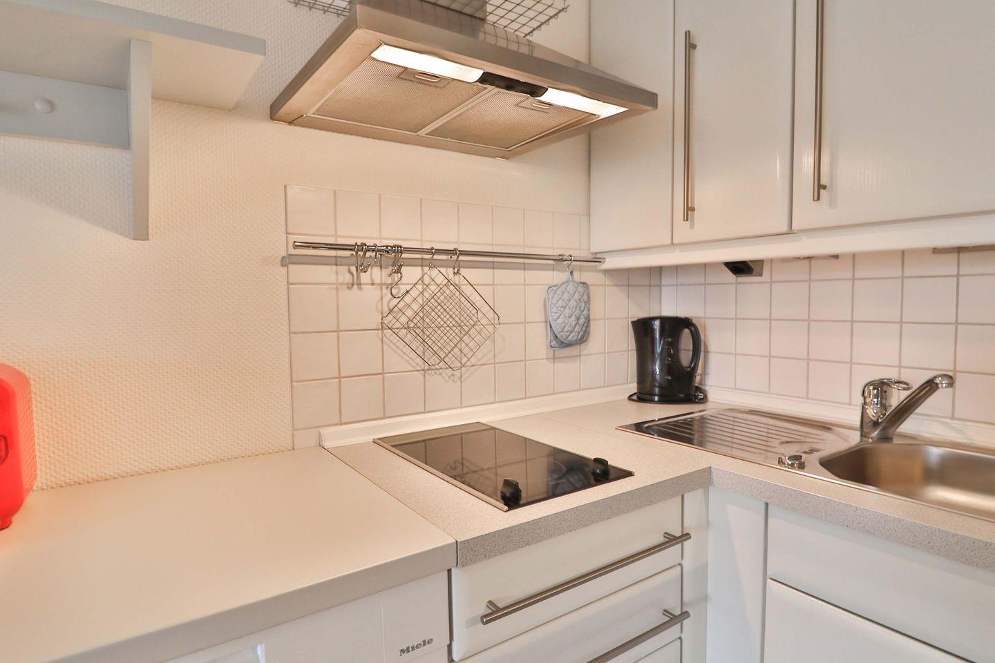 Die offene Küche mit Bartisch und -hockern für 2 Personen verfügt über eine Küchenzeile, die ausreichend Platz bietet, um ein leckeres Essen zuzubereiten. Hier finden Sie ein Spülbecken, einen kleinen Backofen, eine Mikrowelle, ein 2-Platten-Ceranfeld, eine Spülmaschine, einen Kühlschrank mit integriertem Gefrierfach, eine Filterkaffeemaschine, eine Tassimo-Kapselmaschine, Toaster und Wasserkocher. Neben diversen Küchenutensilien enthält die Küche eine gute Auswahl an Geschirr.
