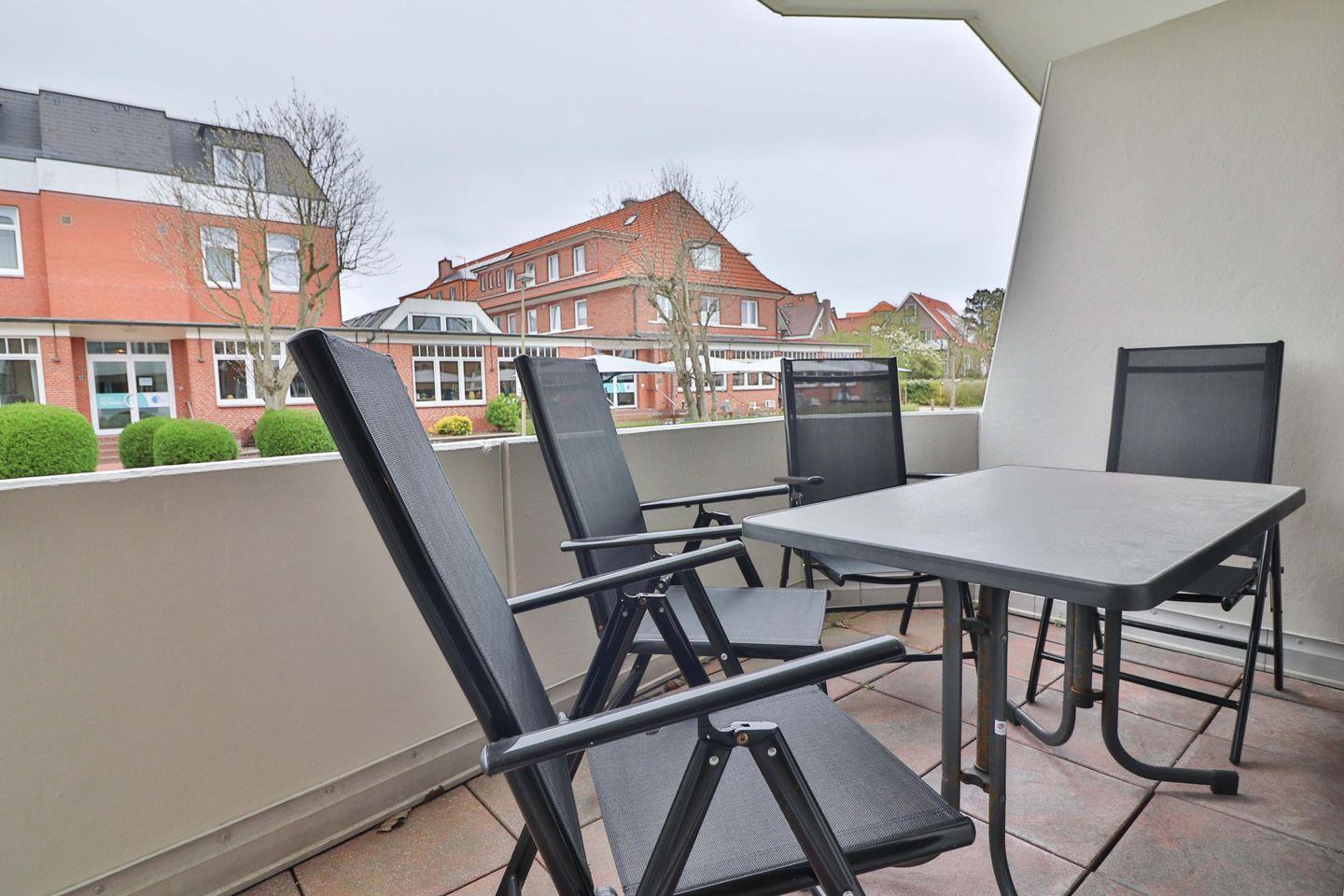 Auf dem großzügigen Balkon können Sie die gesunde Meeresluft und - je nach Wind - das Meeresrauschen genießen und vorbeifahrende Kutschen beobachten.