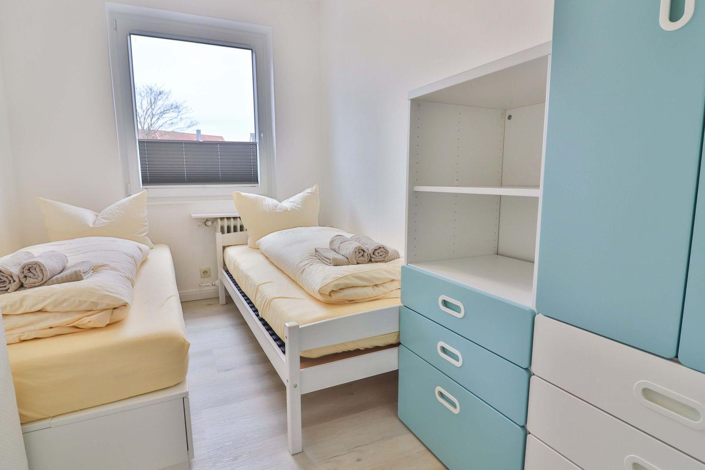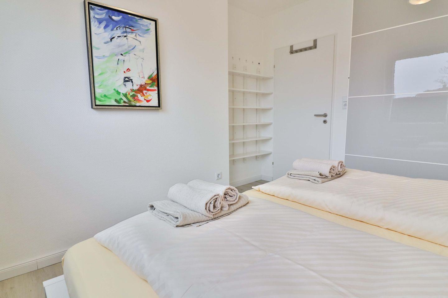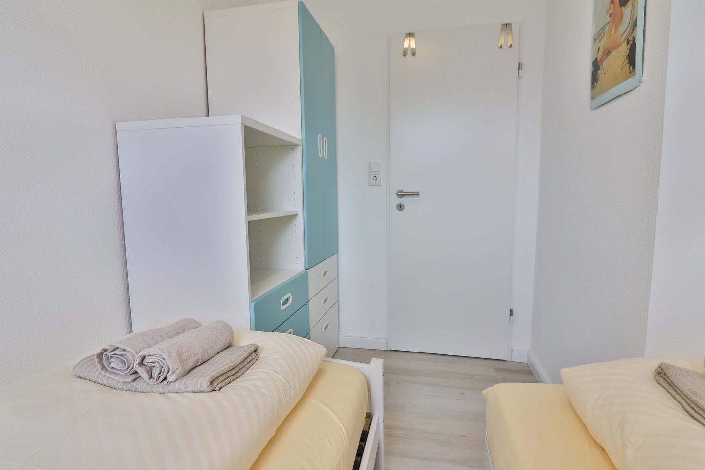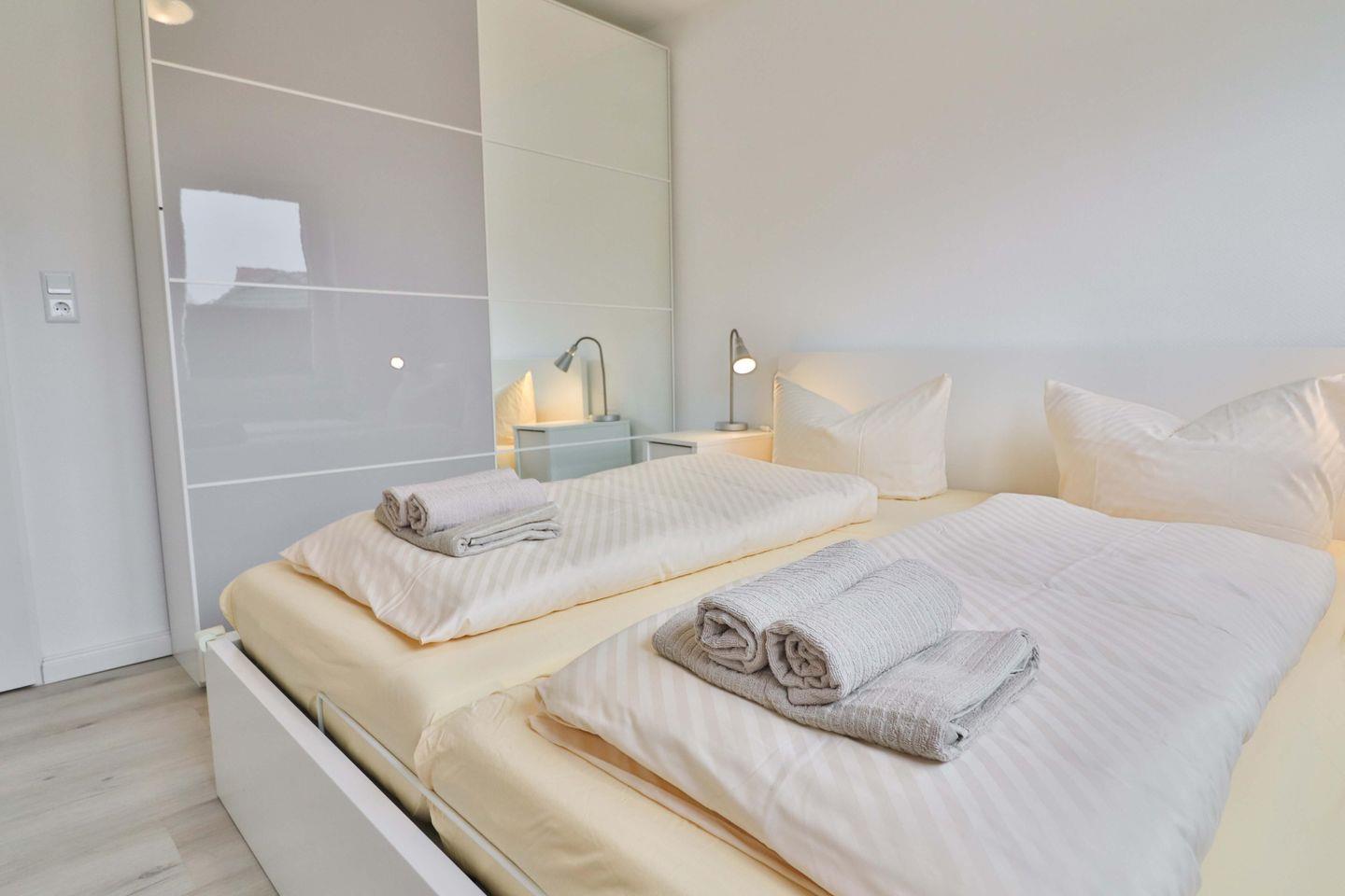 Das Hauptschlafzimmer mit einem komfortablen Doppelbett der Größe 180×200 cm, einem großen Kleiderschrank sowie einem offenen Wandregal für Ihre persönlichen Dinge bietet Ihnen entspannte Nächte. Das zweite Schlafzimmer ist mit zwei Einzelbetten der Größe 90×200 cm und 90x180 cm ausgestattet. Eine Kommode bietet in diesem Zimmer zusätzlichen Stauraum für Ihre Habseligkeiten.