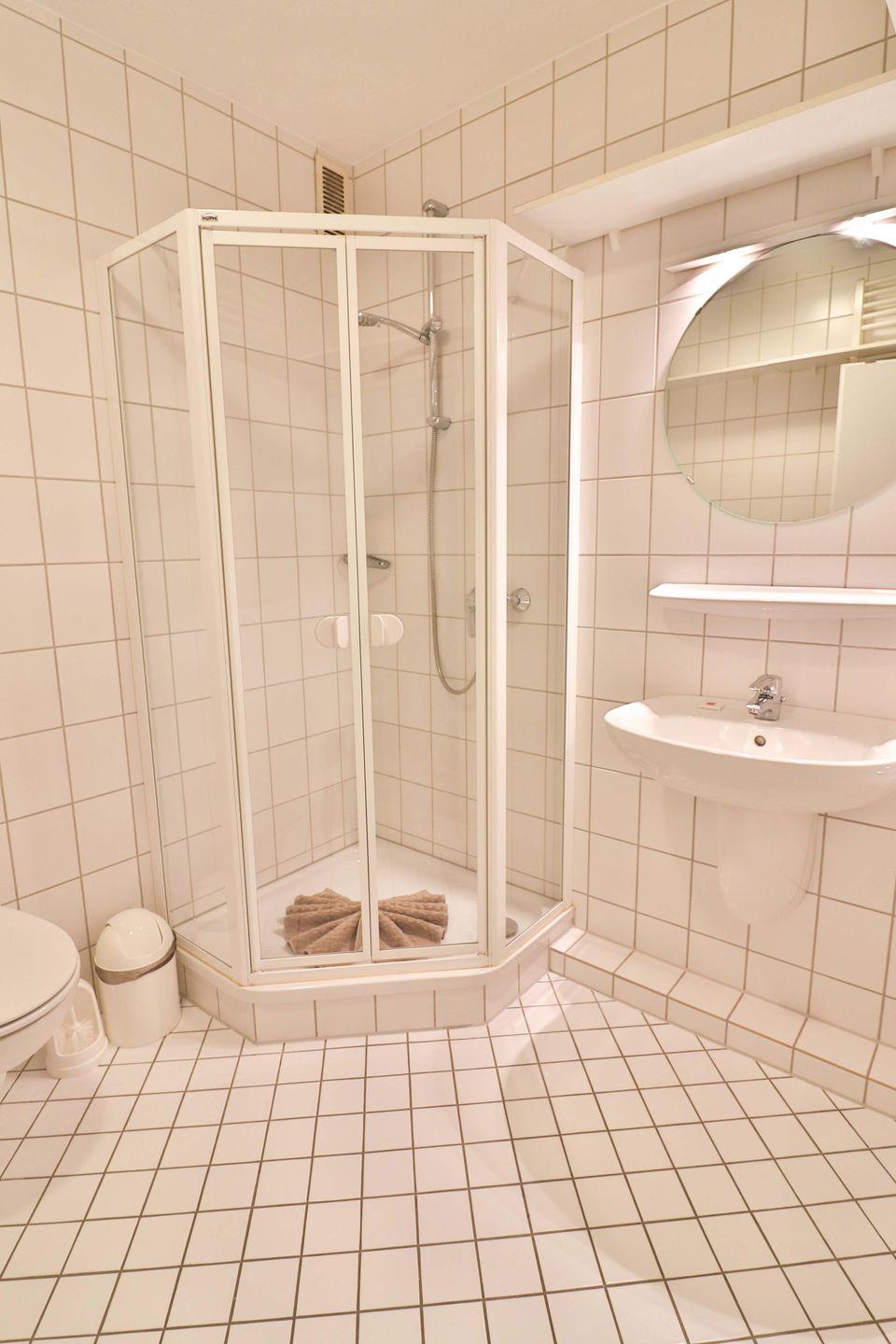 Das große Badezimmer bietet eine Dusche, ein Waschbecken sowie ein WC. Hier finden Sie außerdem Kleiderhaken und Wandregale für Ihre persönlichen Utensilien. In einer Wandnische steht hier der Waschtrockner. Ein Handtuchheizkörper sorgt für wohlige Wärme.