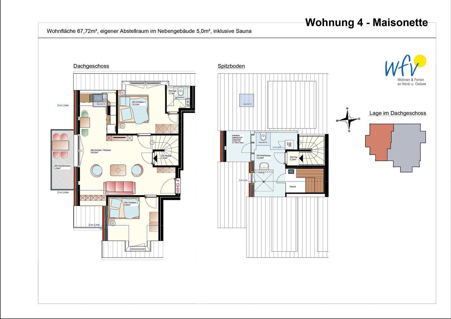 Die zwei separaten Schlafzimmer im Dachgeschoss bieten Ihnen sowohl Komfort, als auch Privatsphäre. Ein Schlafzimmer ist mit einem komfortablen Kingsize-Boxspringbett ausgestattet, das zweite Schlafzimmer beinhaltet zwei Einzelbetten, die bei Bedarf auch zusammengeschoben werden können.