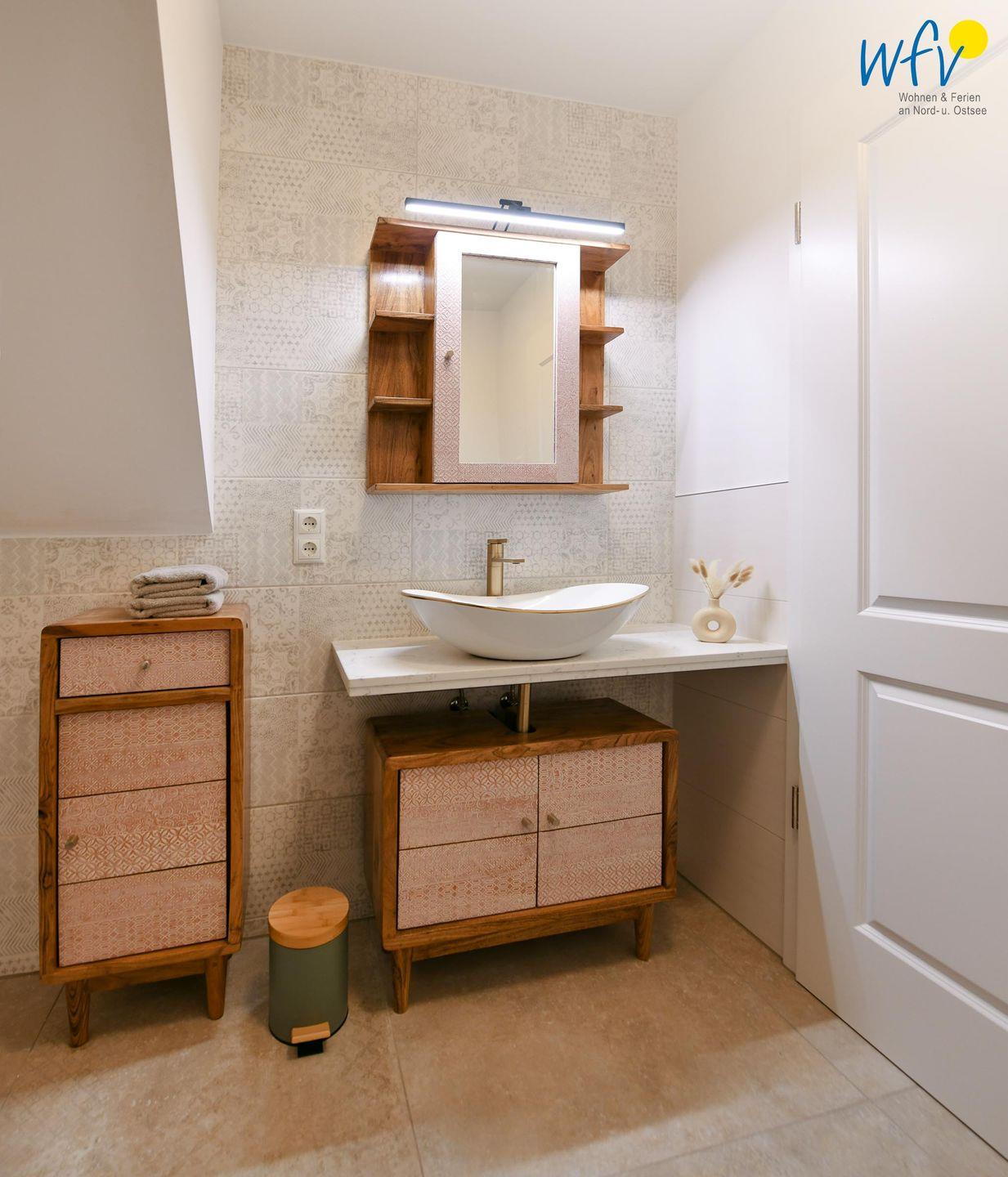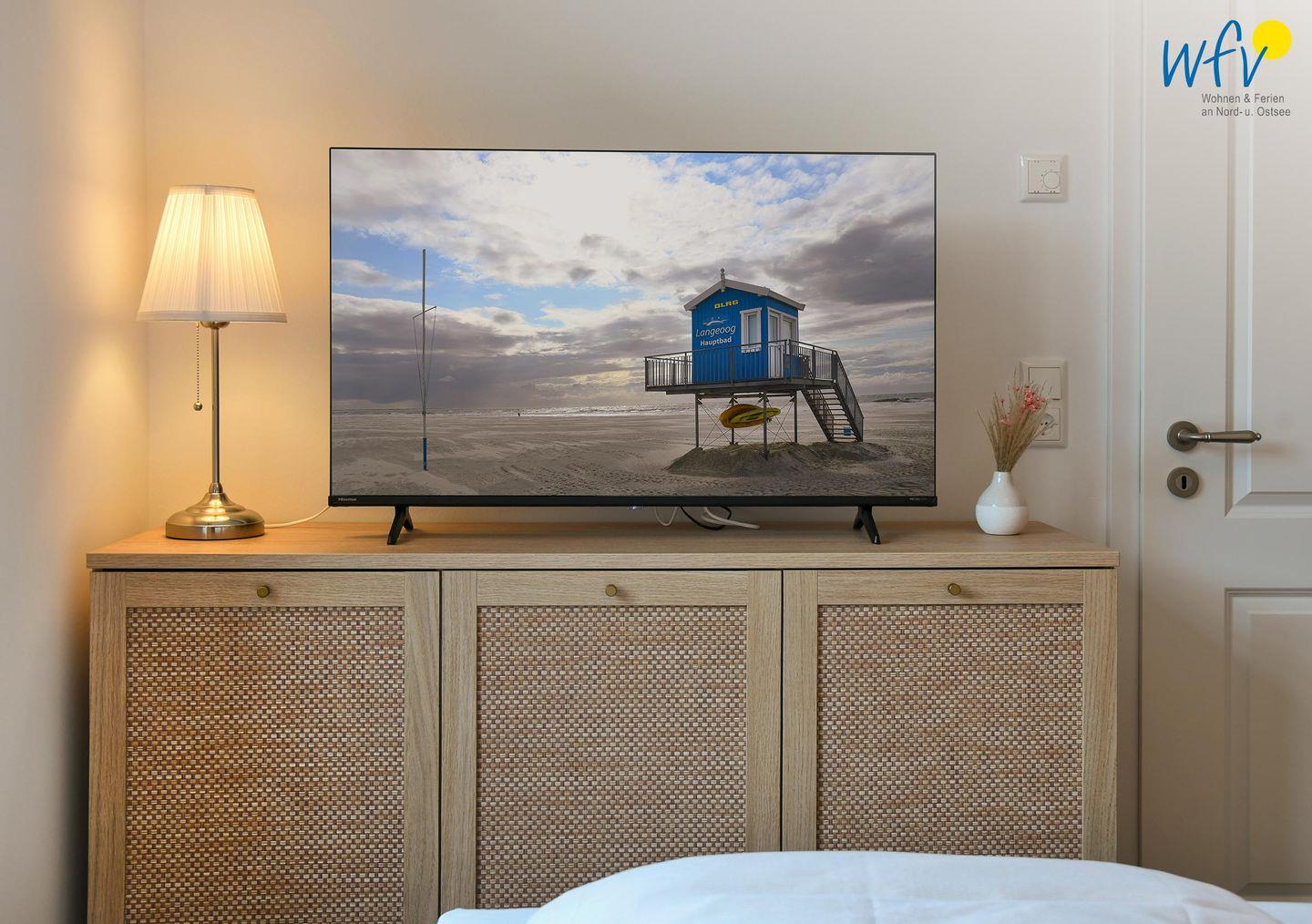 Die Maisonette-Ferienwohnung verfügt über ein modernes, offenes Wohnkonzept über zwei Etagen, das für ein weites Raumgefühl sorgt. Im Dachgeschoss sind Wohnbereich und Küche harmonisch miteinander verbunden, sodass Sie hier nach dem Strandtag oder der Fahrradtour gemütliche Abende auf dem bequemen Sofa verbringen, fernsehen und lesen können oder das gemeinsame Kochen genießen. Für kulinarische Erlebnisse ist die moderne Küche mit einem 4-Platten-Induktionsherd, einem Backofen, einer Mikrowelle, einem Kühlschrank mit Gefrierfach sowie einer Spülmaschine ausgestattet. Der angrenzende Wohnbereich lädt zu gemeinsamen Mahlzeiten ein.