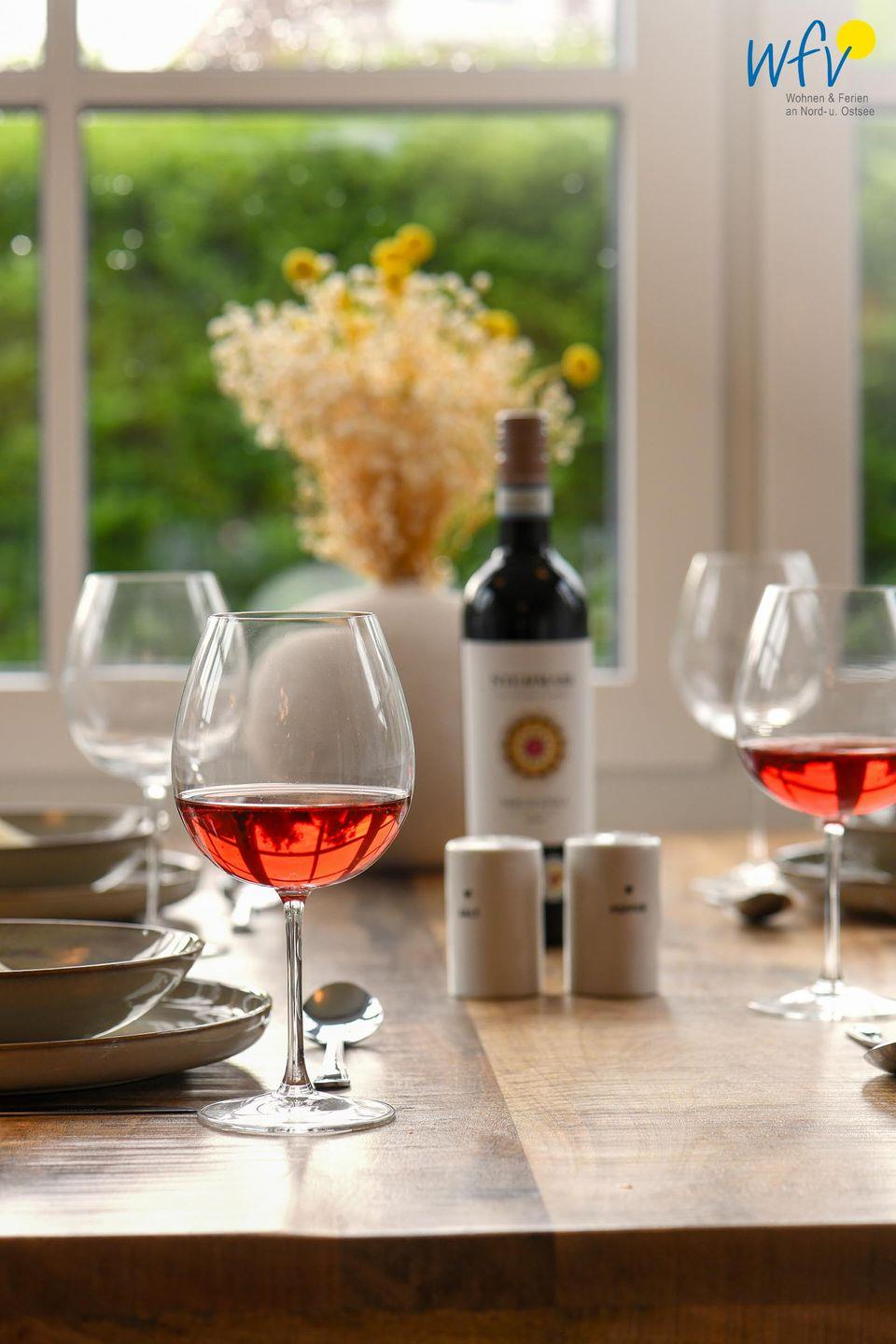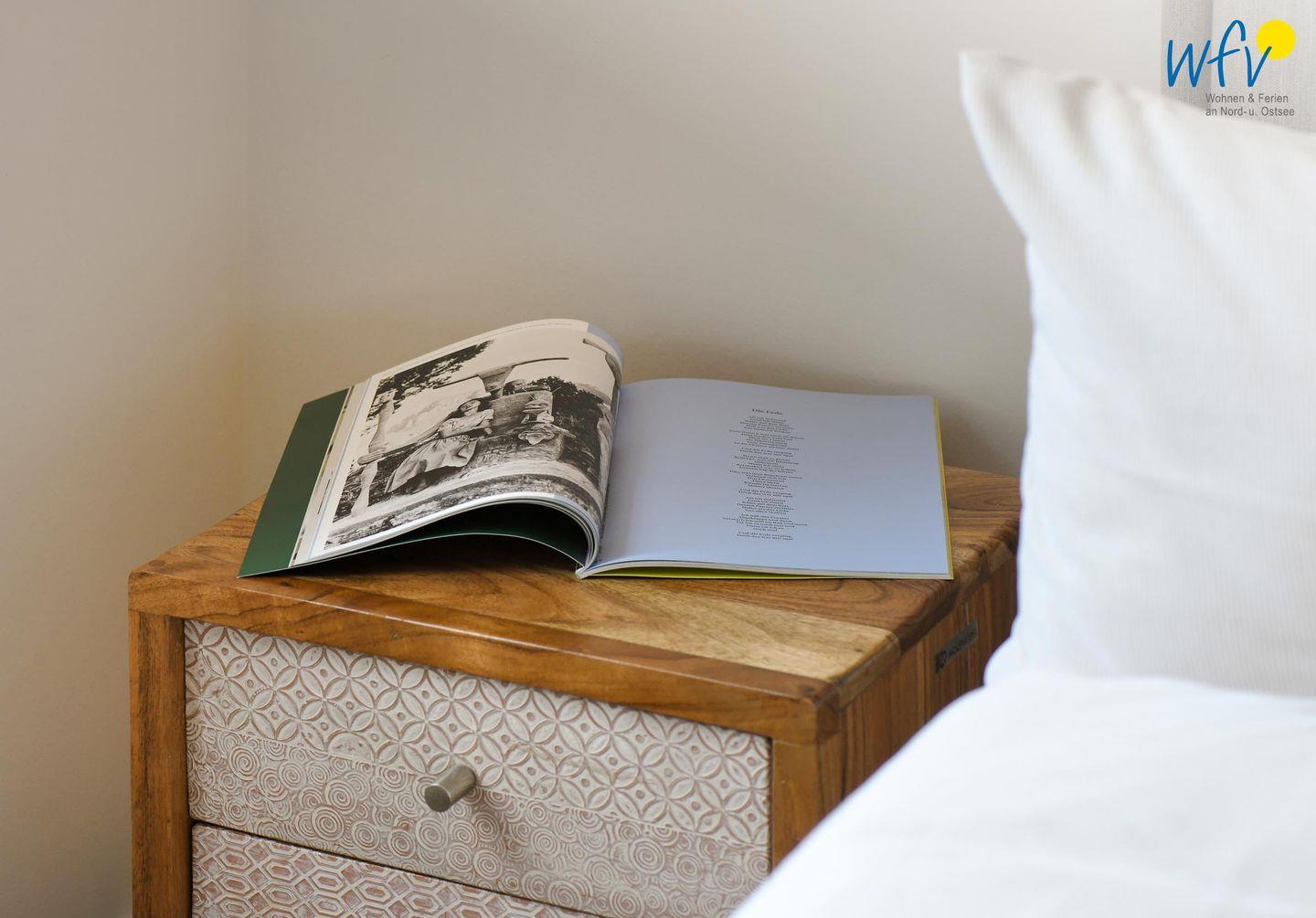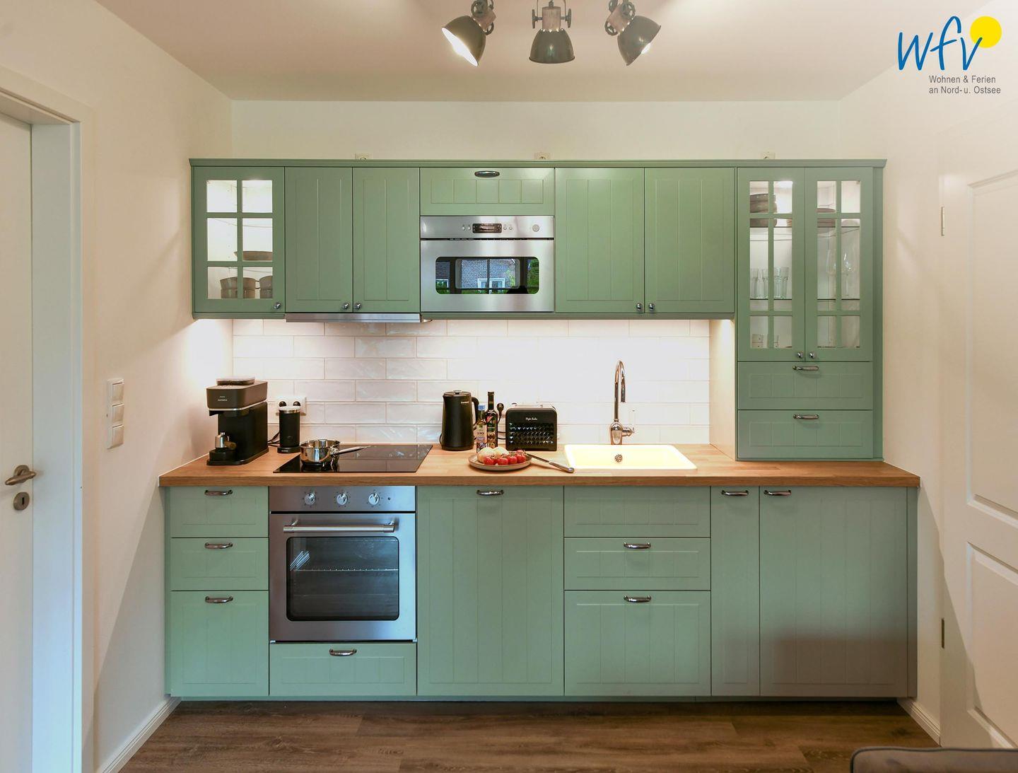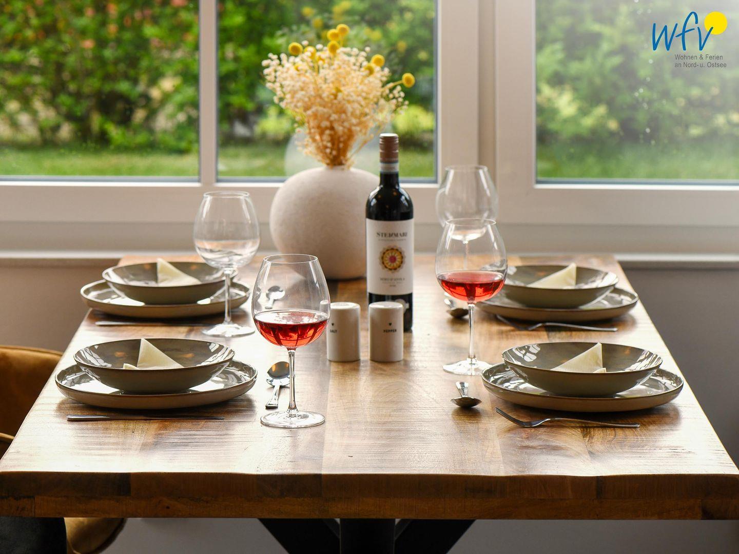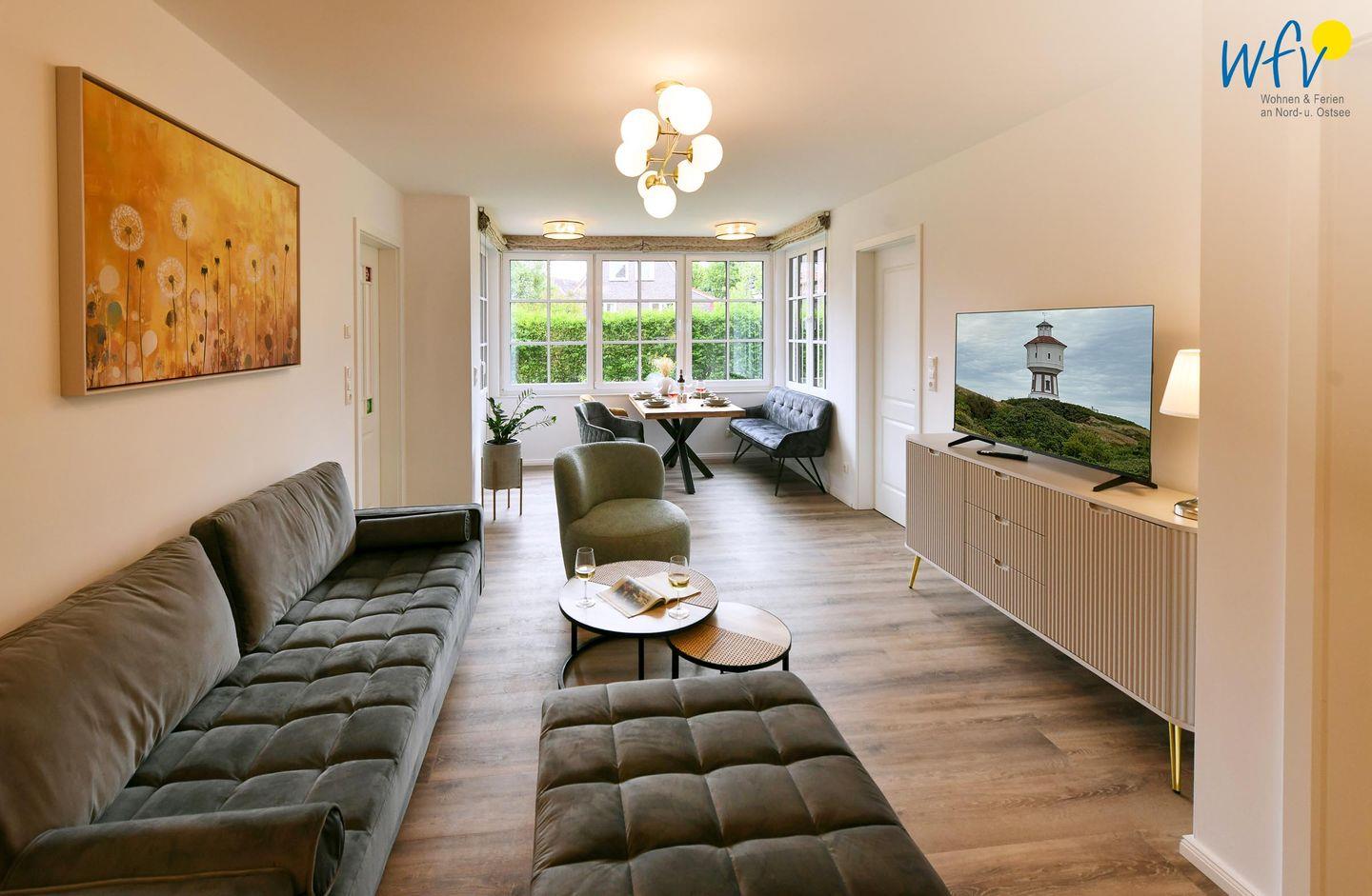 Die Ferienwohnung verfügt über ein modernes, offenes Wohnkonzept, das für ein weites Raumgefühl sorgt. Wohnbereich und Küche sind harmonisch miteinander verbunden, sodass Sie hier nach dem Strandtag oder der Fahrradtour gemütliche Abende auf dem bequemen Sofa verbringen, fernsehen und lesen können oder das gemeinsame Kochen genießen. Für kulinarische Erlebnisse ist die moderne Küche mit einem 4-Platten-Induktionsherd, einem Backofen, einer Mikrowelle, einem Kühlschrank mit Gefrierfach sowie einer Spülmaschine ausgestattet. Der Essbereich mit breiter Fensterfront und schönem Lichteinfall lädt zu entspannten Mahlzeiten ein.