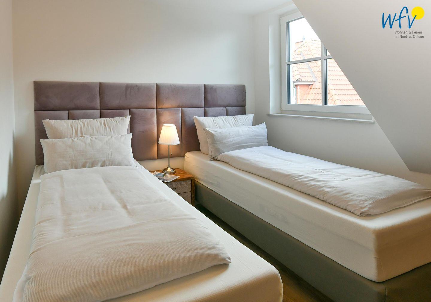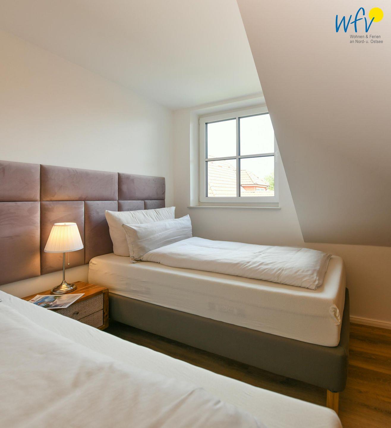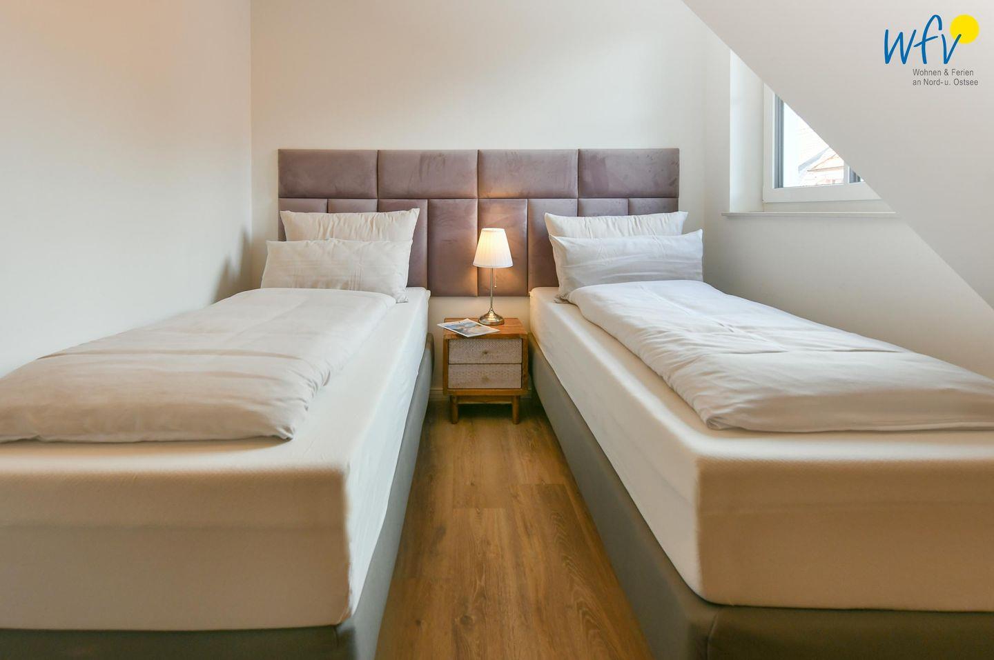 Die zwei separaten Schlafzimmer im Dachgeschoss bieten Ihnen sowohl Komfort, als auch Privatsphäre. Das Elternschlafzimmer ist mit einem großen Doppelbett ausgestattet (180 cm), das Kinderschlafzimmer mit zwei eleganten Einzelbetten, die bei Bedarf auch zu einem großen Doppelbett zusammengeschoben werden können.