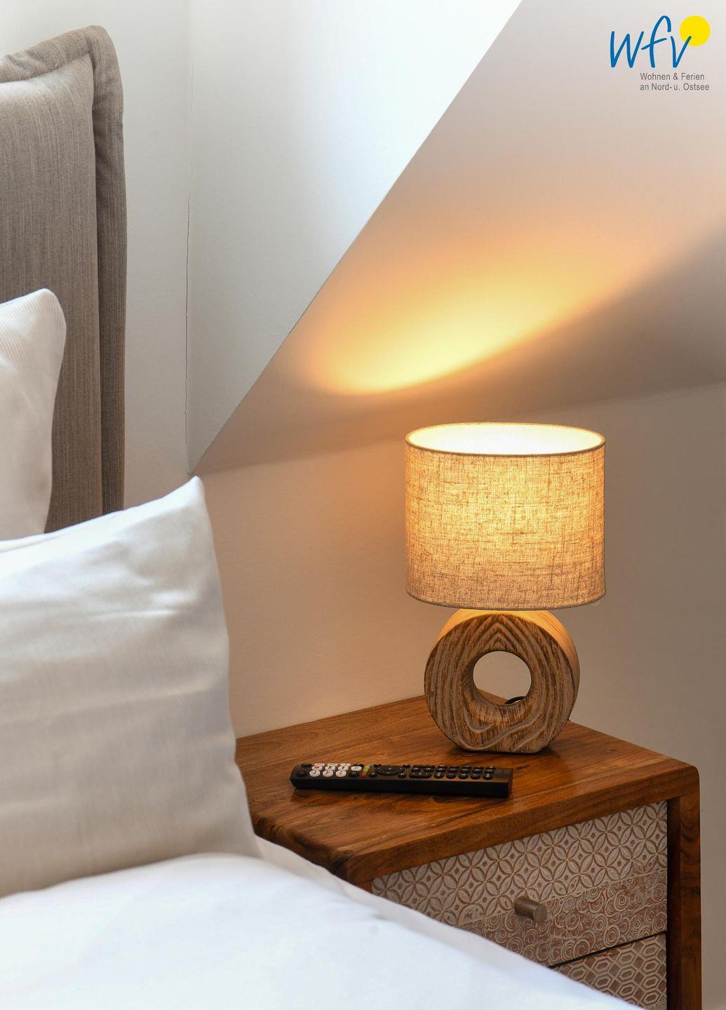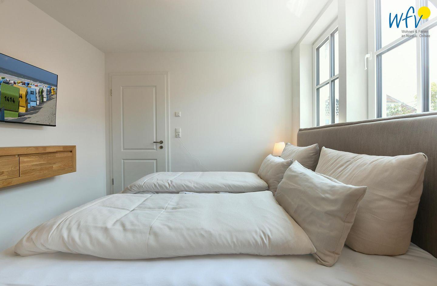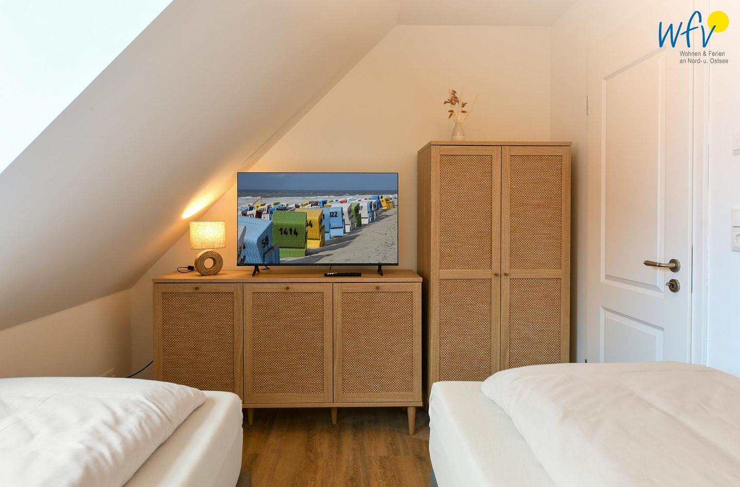 Die zwei separaten Schlafzimmer im Dachgeschoss bieten Ihnen sowohl Komfort, als auch Privatsphäre. Das Elternschlafzimmer ist mit einem großen Doppelbett ausgestattet (180 cm), das Kinderschlafzimmer mit zwei eleganten Einzelbetten, die bei Bedarf auch zu einem großen Doppelbett zusammengeschoben werden können.