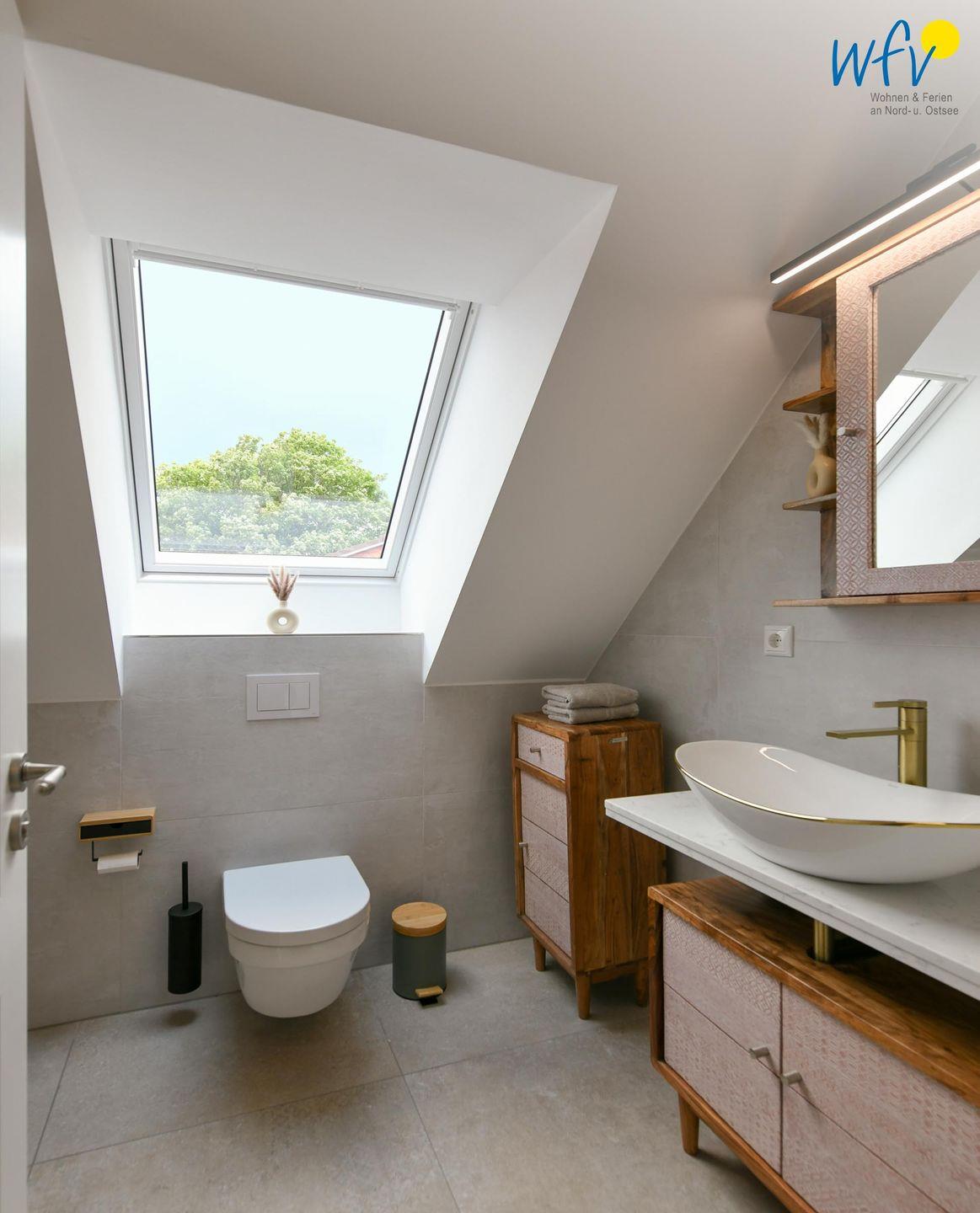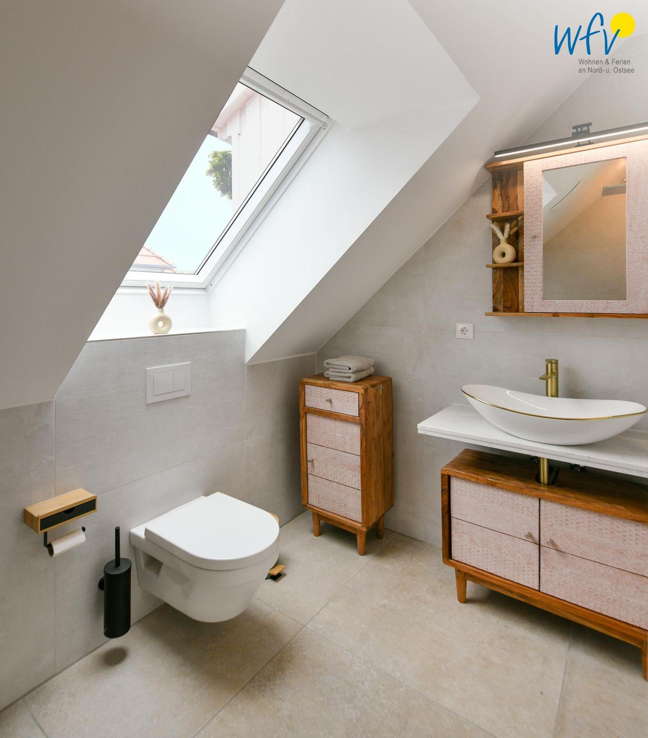 Zwei elegante Tageslichtbäder im Dachgeschoss und im Spitzboden sorgen für angenehme Ausweichmöglichkeiten. In dem oberen Bad mit Dusche und eigener Sauna genießen Sie wohltuende Entspannungszeit.
