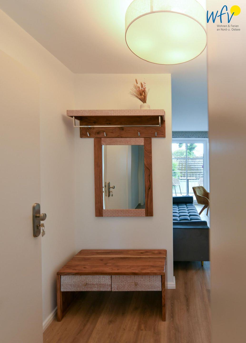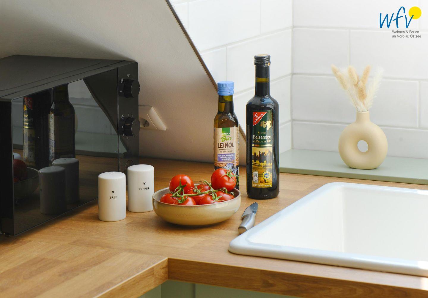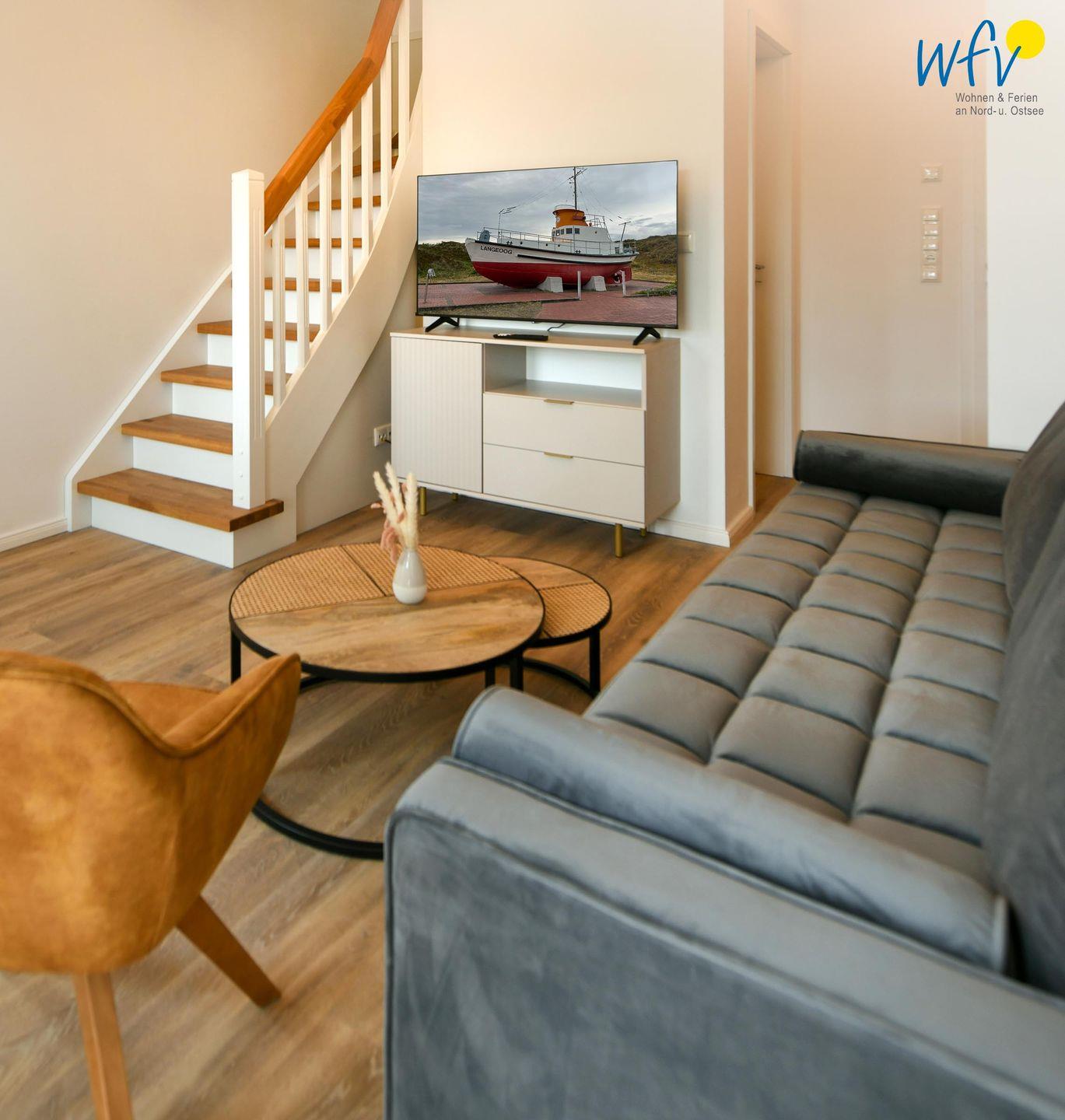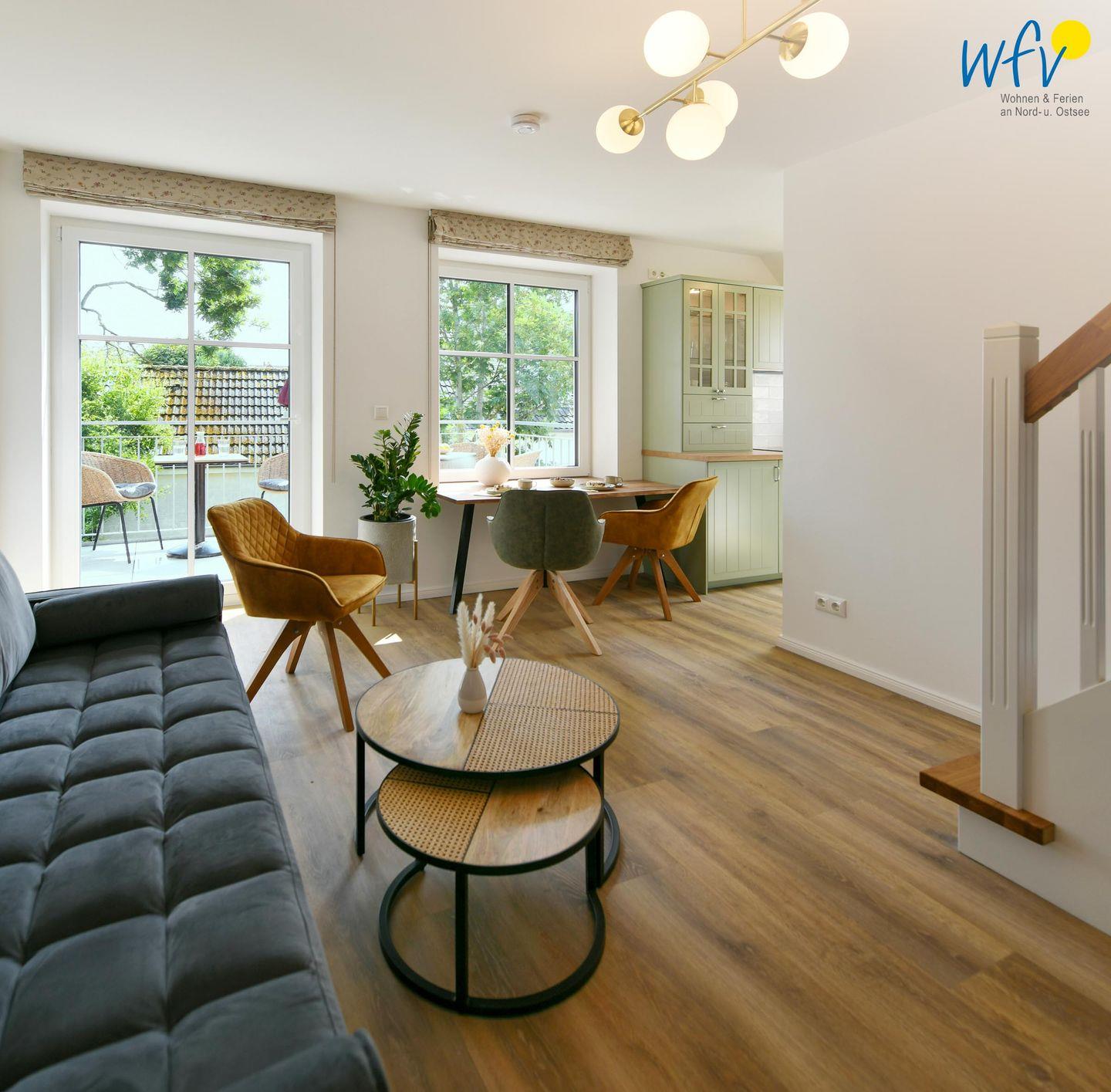 Die Maisonette-Ferienwohnung verfügt über ein modernes, offenes Wohnkonzept über zwei Etagen, das für ein weites Raumgefühl sorgt. Im Dachgeschoss sind Wohnbereich und Küche harmonisch miteinander verbunden, sodass Sie hier nach dem Strandtag oder der Fahrradtour gemütliche Abende auf dem bequemen Sofa verbringen, fernsehen und lesen können oder das gemeinsame Kochen genießen. Für kulinarische Erlebnisse ist die moderne Küche mit einem 4-Platten-Induktionsherd, einem Backofen, einer Mikrowelle, einem Kühlschrank mit Gefrierfach sowie einer Spülmaschine ausgestattet. Der angrenzende Essbereich lädt zu gemeinsamen Mahlzeiten ein.
