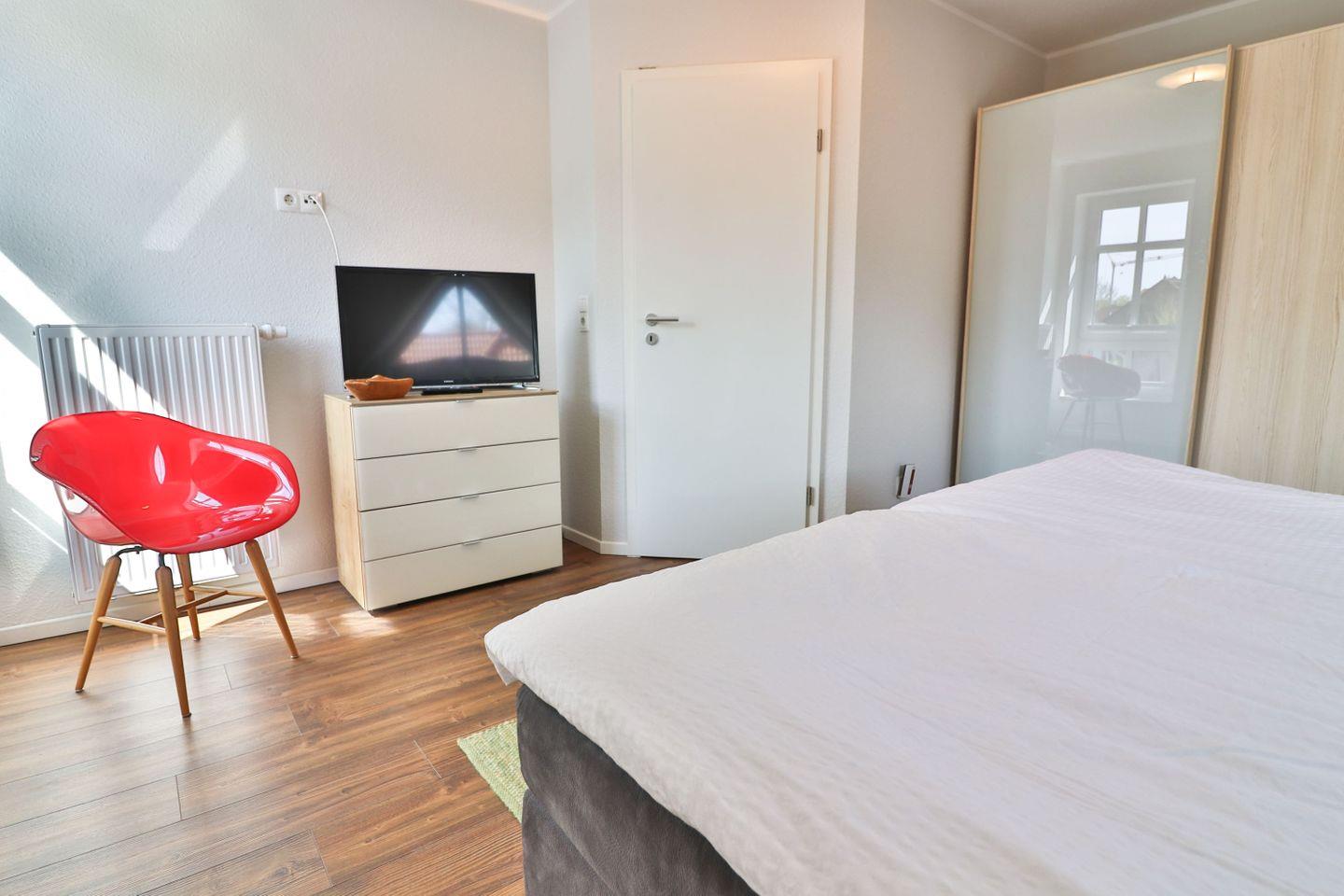 Zwei der drei Schlafzimmer sind mit Doppelbetten (je ca. 180x195 cm) ausgestattet, das dritte enthält zwei Einzelbetten (je 80x190 cm). In allen Schlafzimmern finden Sie hochwertige Boxspringbetten mit passenden Toppern sowie Kleiderschränke und Kommoden für Ihre persönlichen Dinge, in beiden Doppelzimmern ebenfalls Fernseher für zusätzlichen Komfort. Die Verdunkelung erfolgt über Plissees für einen erholsamen Schlaf.