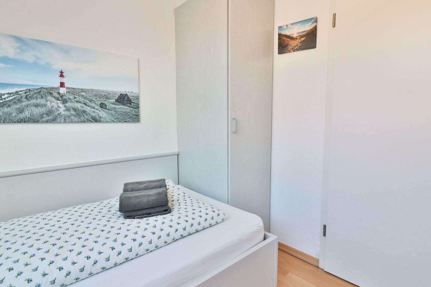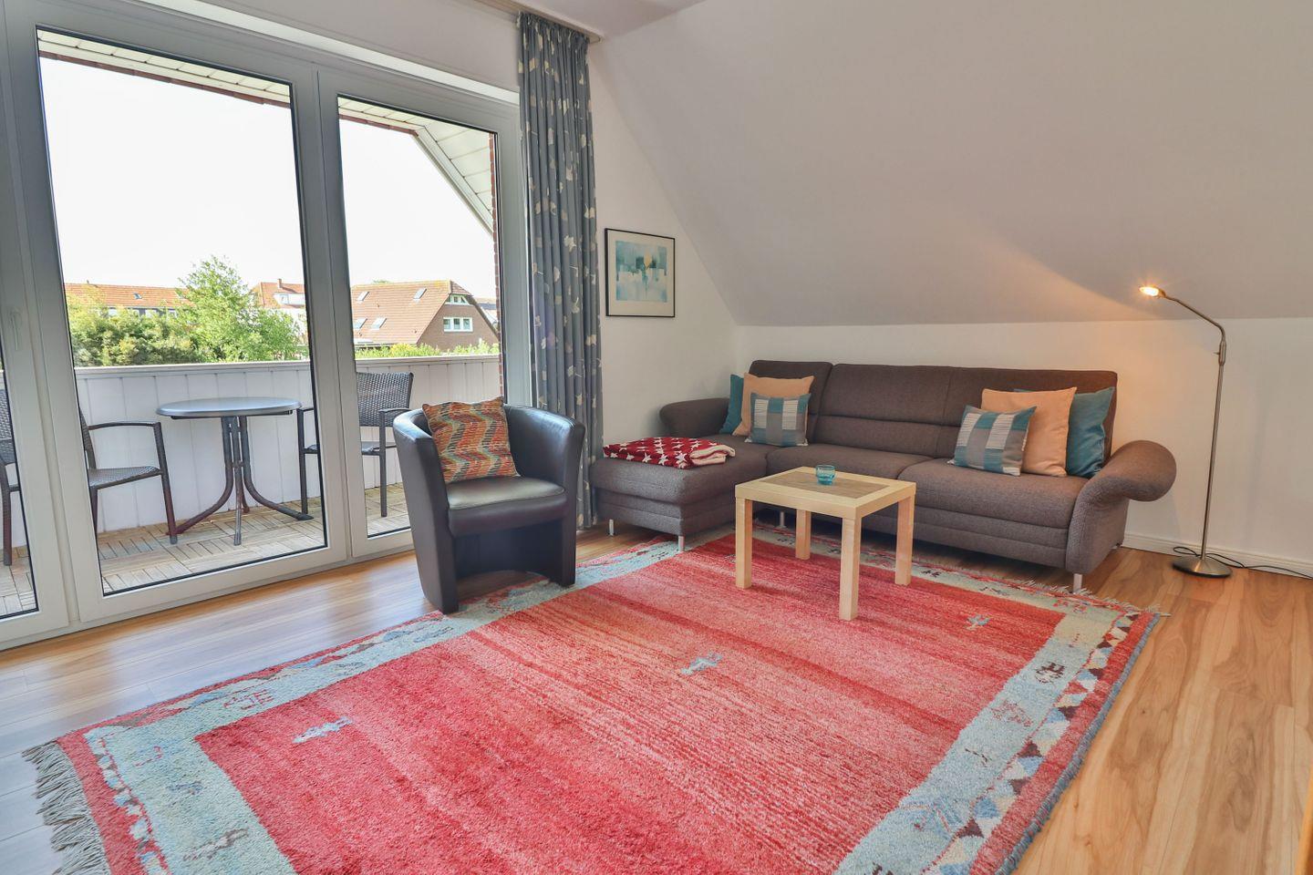Die Wohnung 4 im Haus Winter befindet sich auf der beliebten Nordseeinsel Langeoog in der Gartenstraße 8 im ersten Stock eines gepflegten Hauses. Die Ferienwohnung bietet auf ca. 65 m² Platz für bis zu vier Personen und ist mit zwei separaten Schlafzimmern, eines mit Doppelbett (180 x 190 cm) und das andere mit zwei Einzelbetten (90 x 200 cm und 100 x 200 cm) und einem Wohnzimmer komfortabel ausgestattet – eine ideale Wahl für Familien oder Paare!