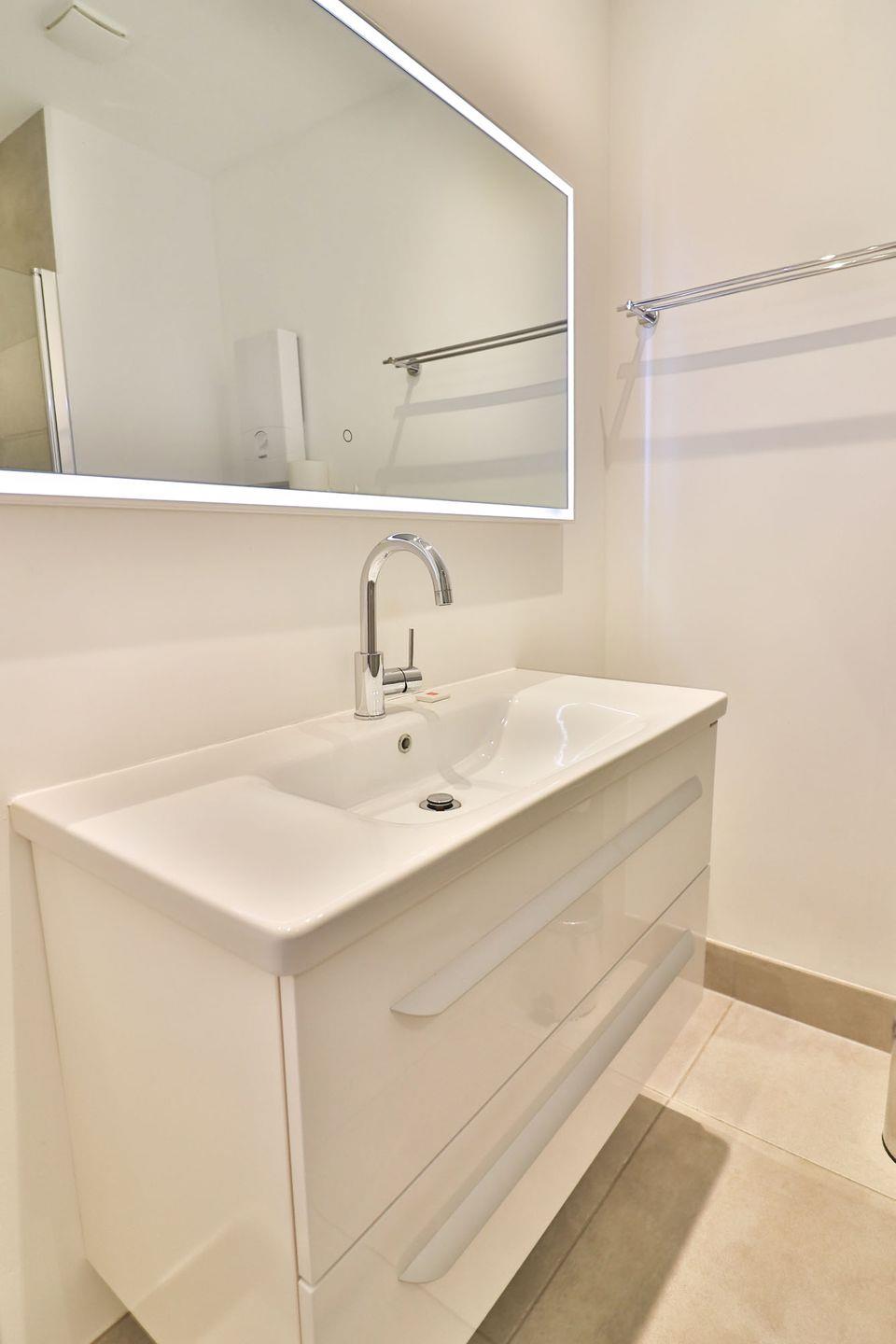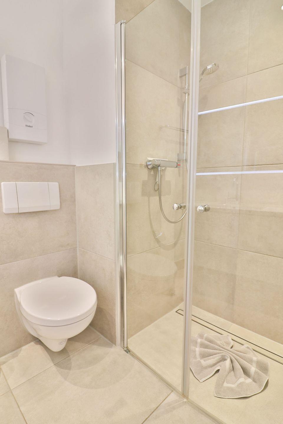 Das moderne Badezimmer ist mit einer bodengleichen Dusche, Waschbecken, WC, Spiegel und Haartrockner ausgestattet.