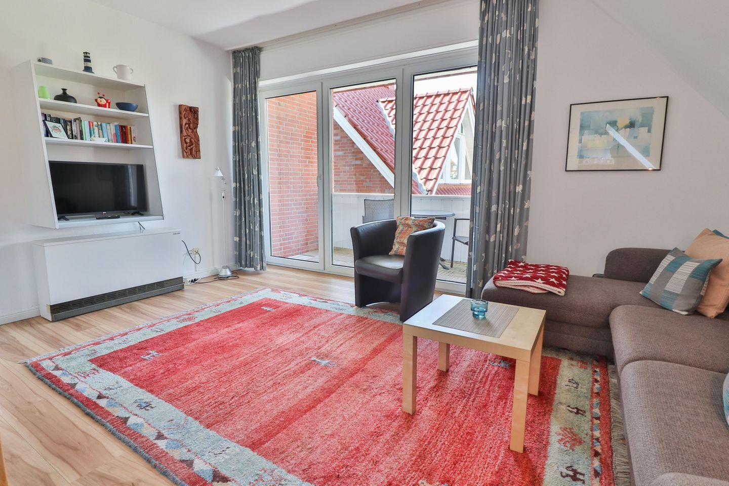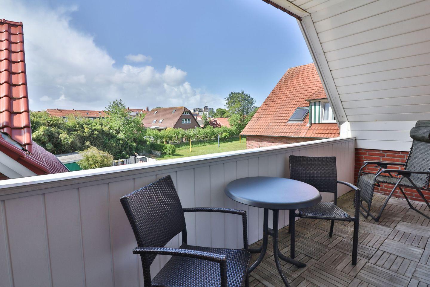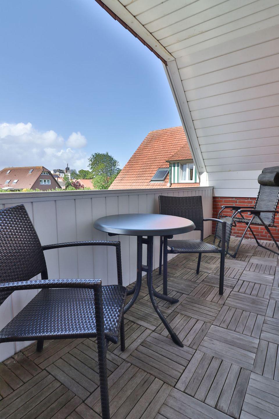 Ein besonderes Highlight ist der überdachte Balkon mit Tisch und Stühlen, auf dem Sie die frische Nordseeluft genießen und den Tag in der klaren Inselbrise ausklingen lassen können.