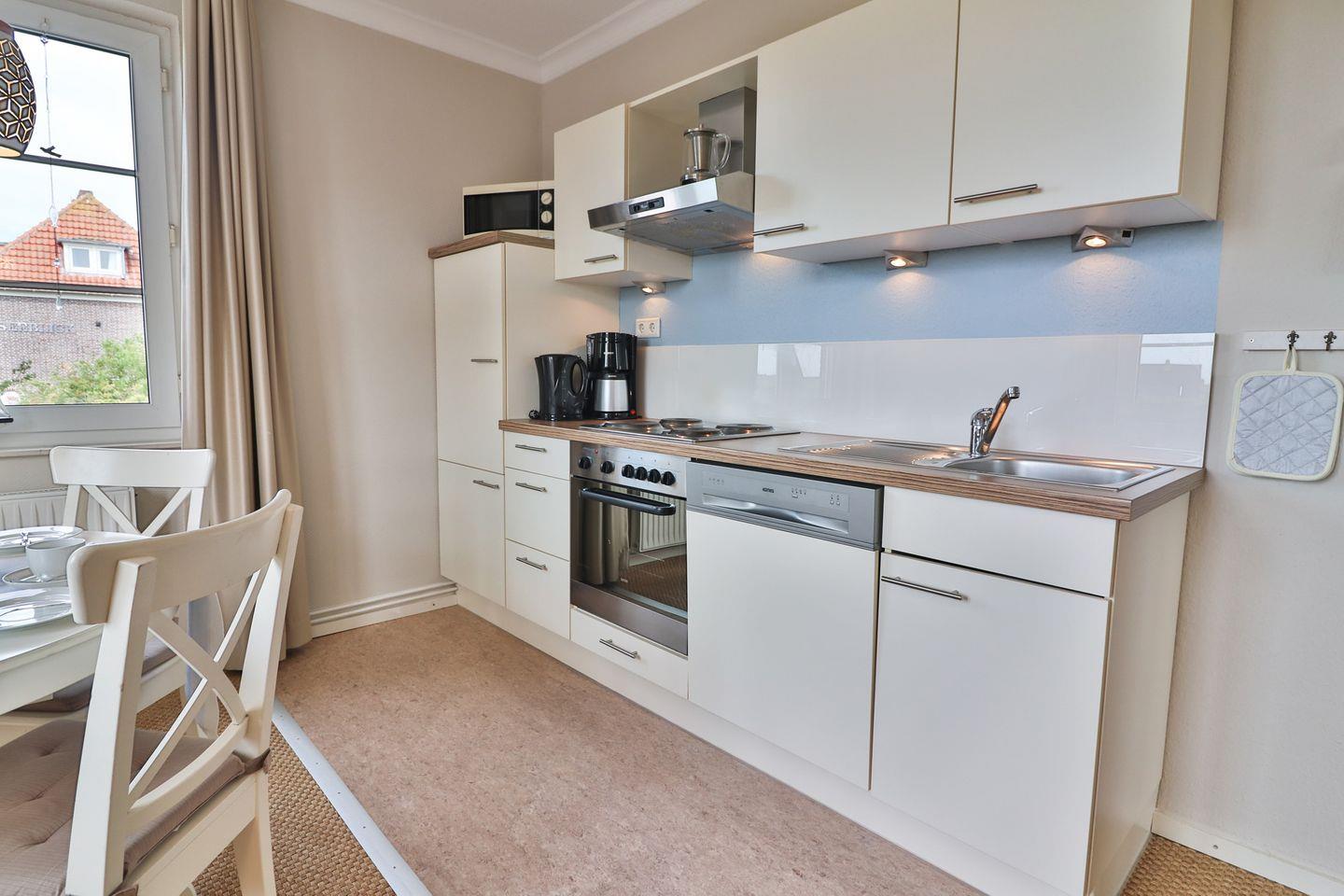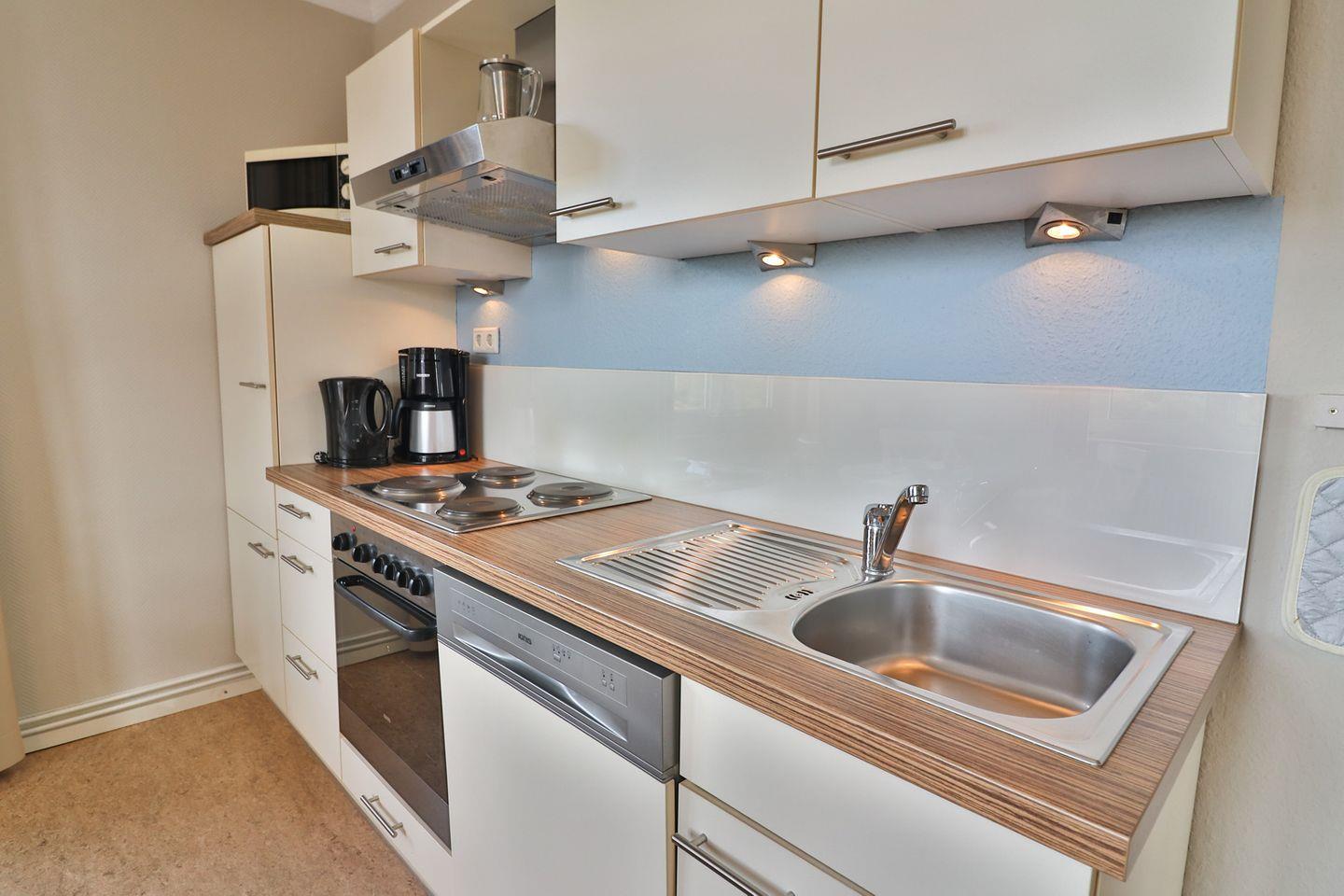 Die kleine Küchenzeile ist vollständig ausgestattet und lässt keine Wünsche offen: Ihnen stehen unter anderem ein Backofen, eine Spülmaschine, eine Mikrowelle, ein 4-Platten-Herd, ein Kühlschrank mit Gefrierfach, eine Kaffeemaschine, ein Toaster, ein Wasserkocher, ein Mixer sowie weitere Küchenutensilien zur Verfügung.