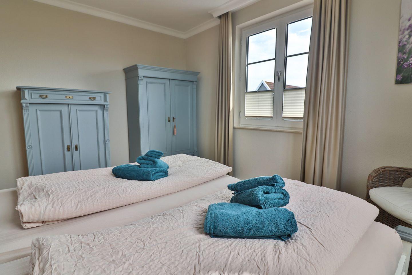 Die Unterkunft umfasst zwei Schlafzimmer, eins mit Doppelbett (180 x 200 cm), das andere mit einem Einzelbett (90 x 200 cm), welches man für ein Kind als vierte Person ausziehen kann. Beide Schlafzimmer sind mit Kleiderschränken ausgestattet. Bettwäsche und Handtücher sind vorhanden, sodass Sie sich um nichts kümmern müssen. Im Badezimmer erwartet Sie eine Dusche, ein Waschbecken, ein WC und ein Haartrockner. Die Wohnung ist als Nichtraucherunterkunft ausgewiesen und verfügt über Sichtschutz an allen Fenstern.