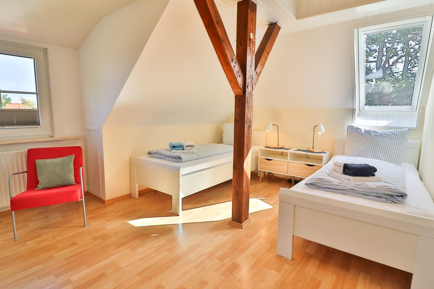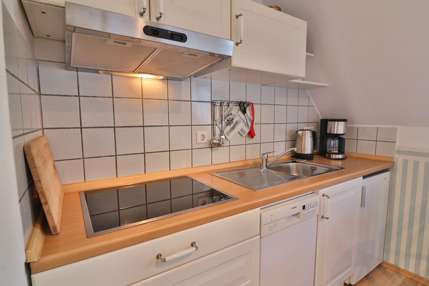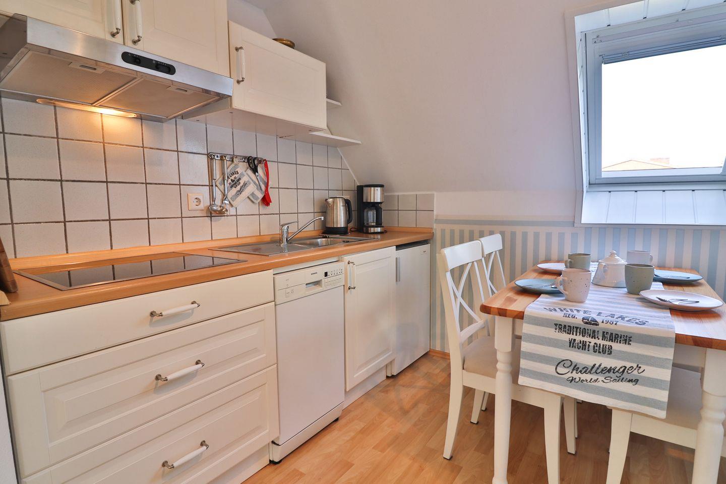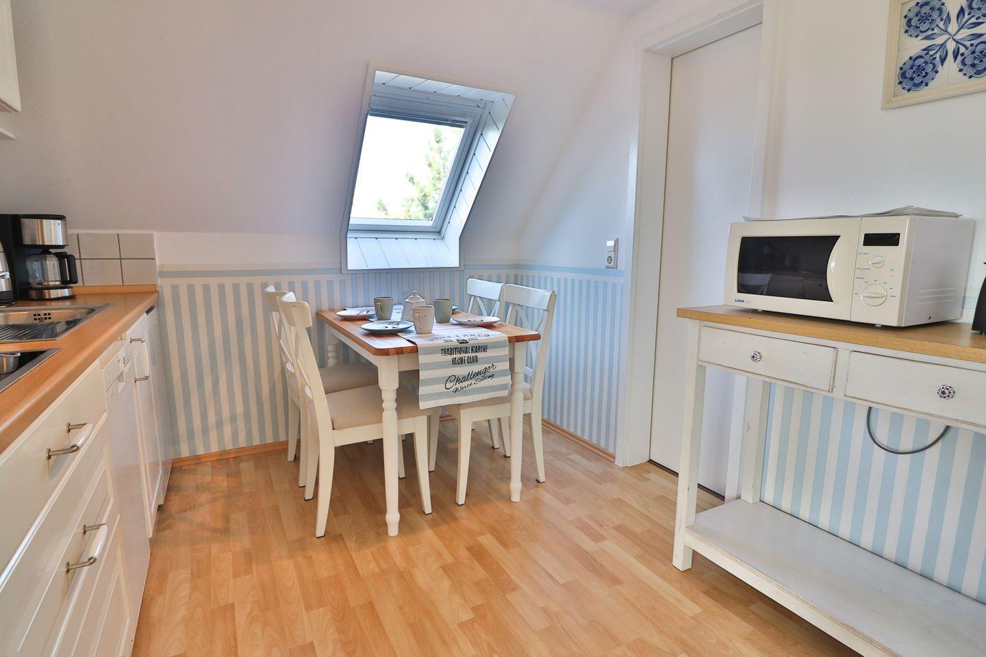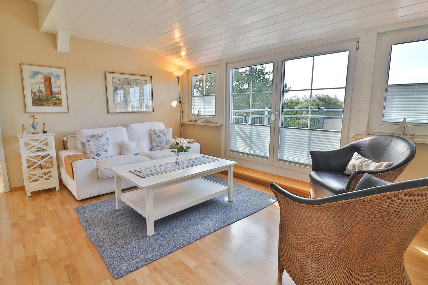 Ein absolutes Highlight der Ferienwohnung ist der nach Süden ausgerichtete Dachbalkon, der mit einer kleinen Sitzgruppe ausgestattet ist und zum Verweilen im Freien einlädt. Von hier aus haben Sie einen herrlichen Fernblick über den Inselwald, die nähere Umgebung und an klaren Tagen bis zum Festland. Alle Fenster verfügen über Sichtschutz, sodass Ihre Privatsphäre zu jeder Zeit gewährleistet ist. Waschmaschine und Trockner können gemeinschaftlich genutzt werden. Bettwäsche und Handtücher sind im Angebot inbegriffen.